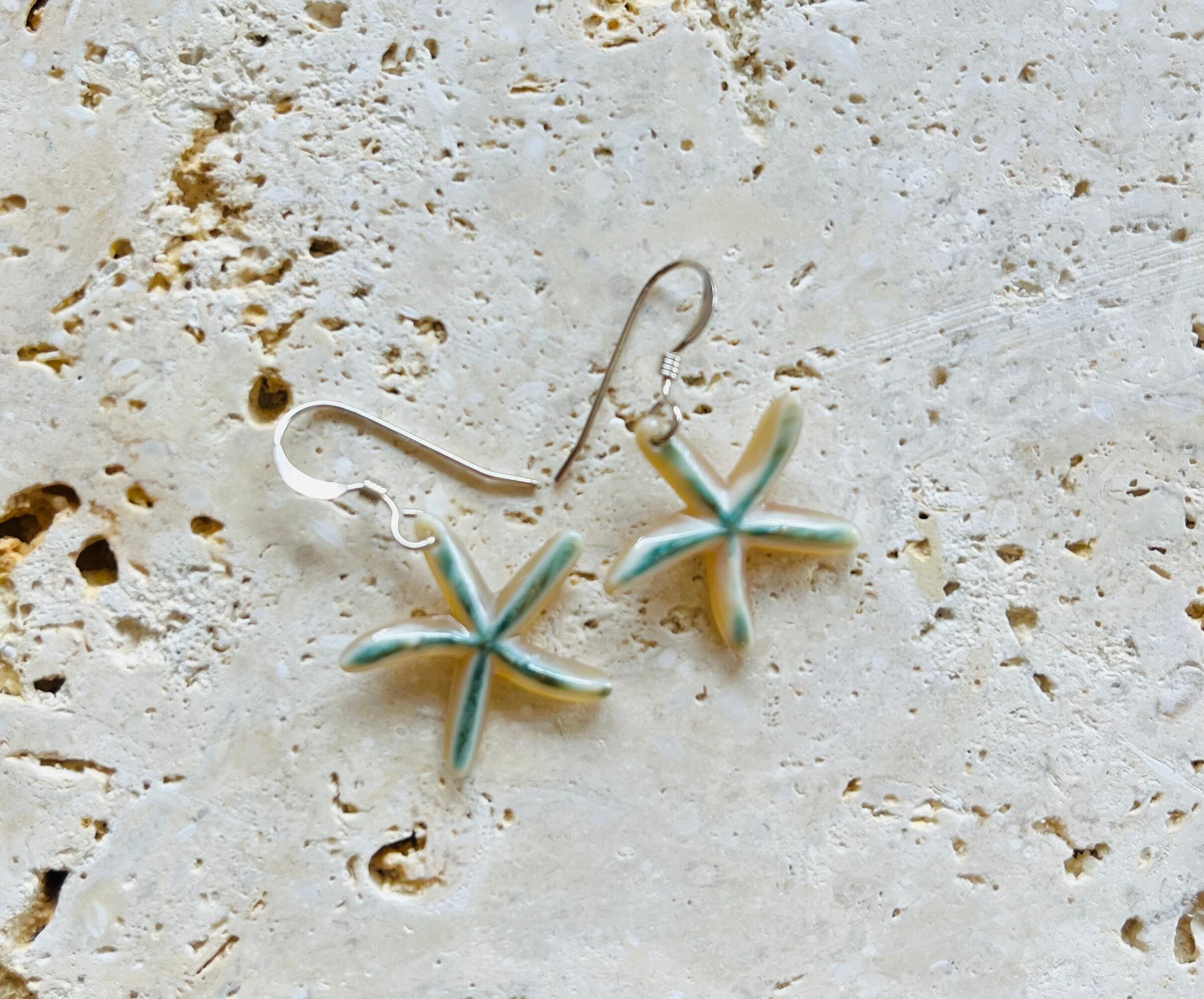 夜光貝ヒトデピアスは、神秘的な輝きを持つ夜光貝を使用した、オシャレで遊び心満載なデザインが魅力です。ヒトデを模したフォルムが耳元で華やかに揺れ、海の雰囲気を感じさせてくれます。カジュアルな装いにも、ちょっとした特別なシーンにもぴったりの一品です!