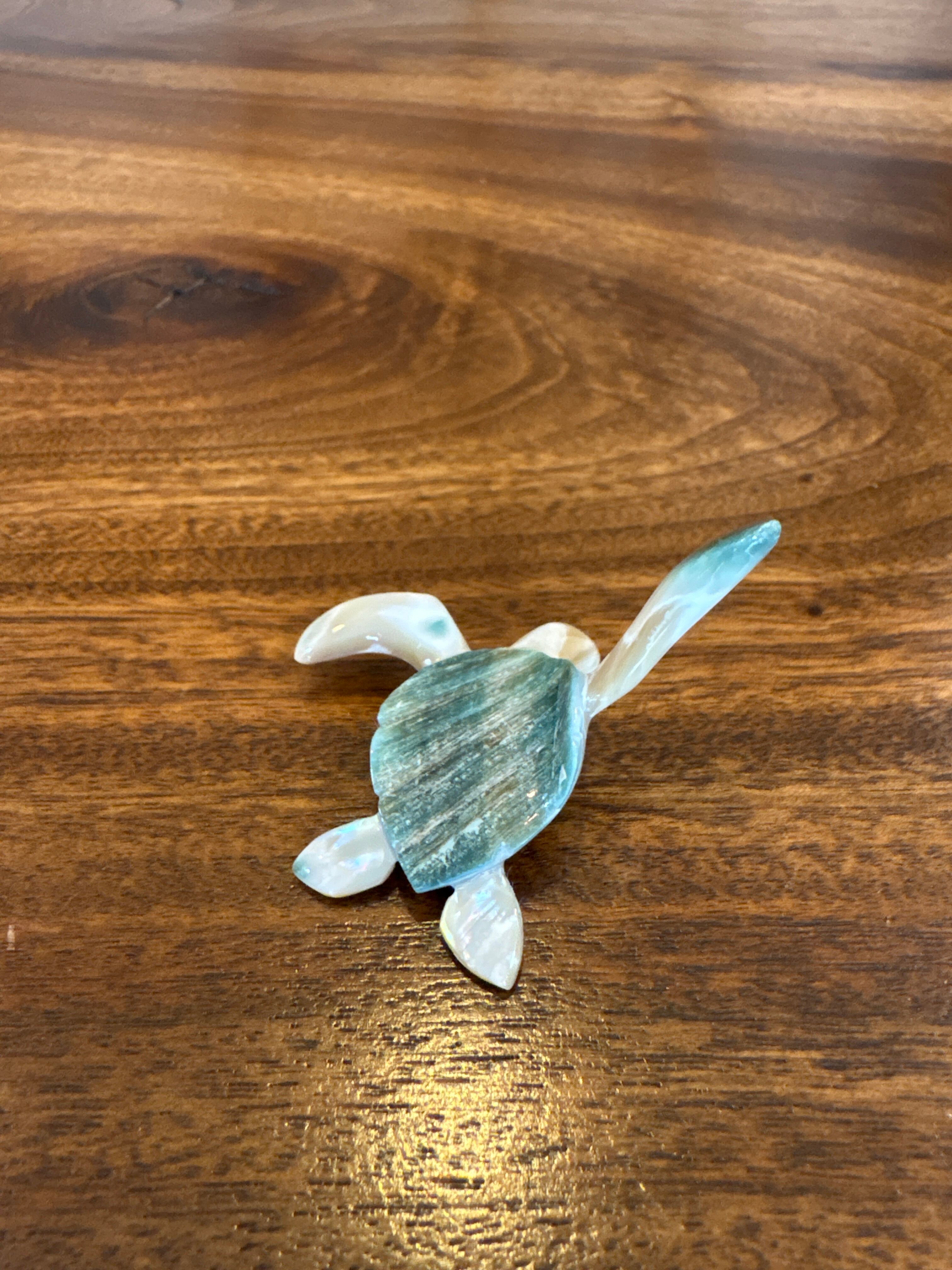 夜光貝の優美な光沢と奥深い色彩を活かして彫り出された、小さなカメのオブジェです。滑らかな曲線と丁寧な仕上げが魅力で、癒しを与えてくれる存在感のある一点。インテリアとしてはもちろん、大切な方への贈り物にもぴったりです。沖縄の海の恵みが感じられる、自然の美をお楽しみください。