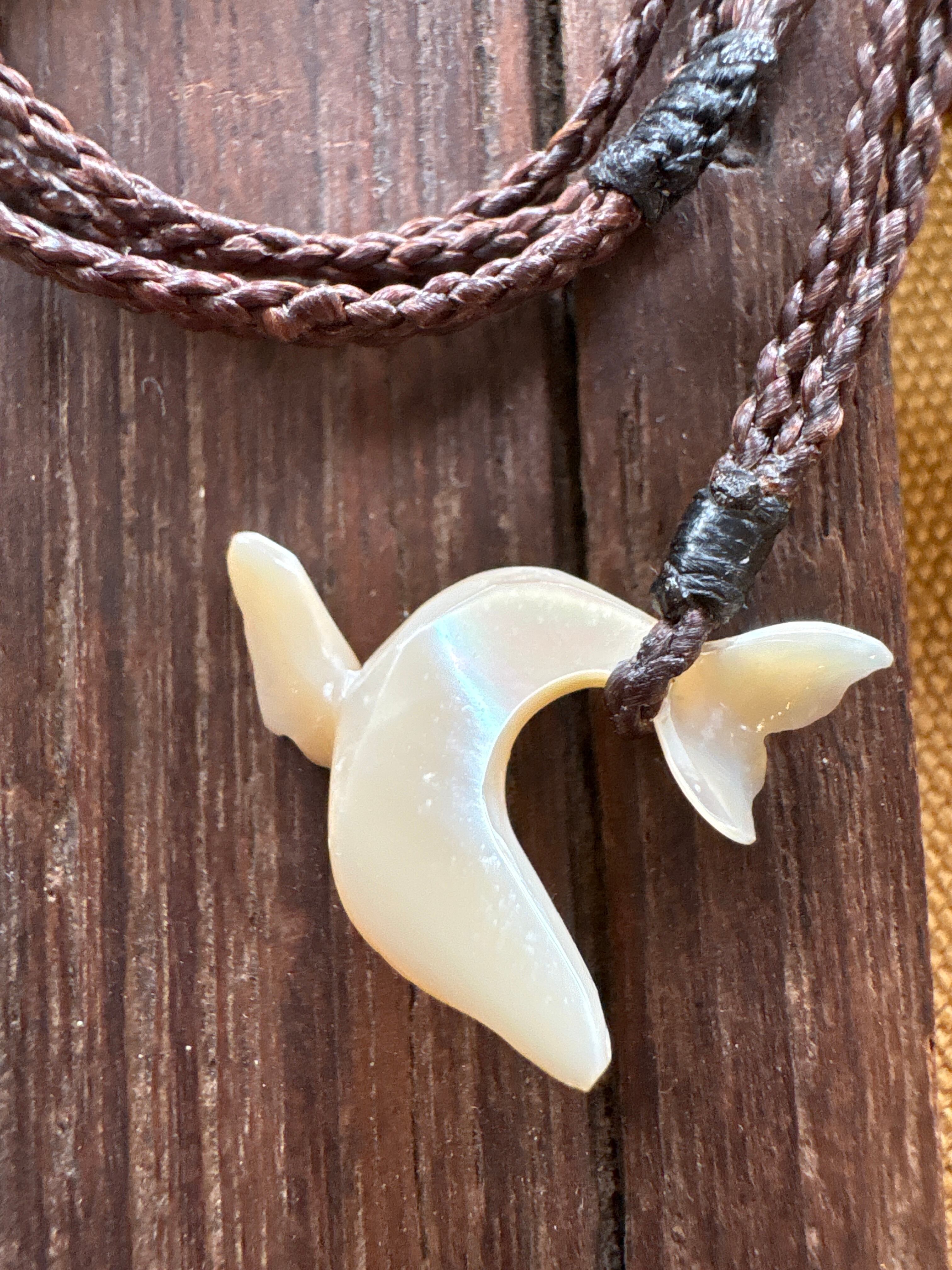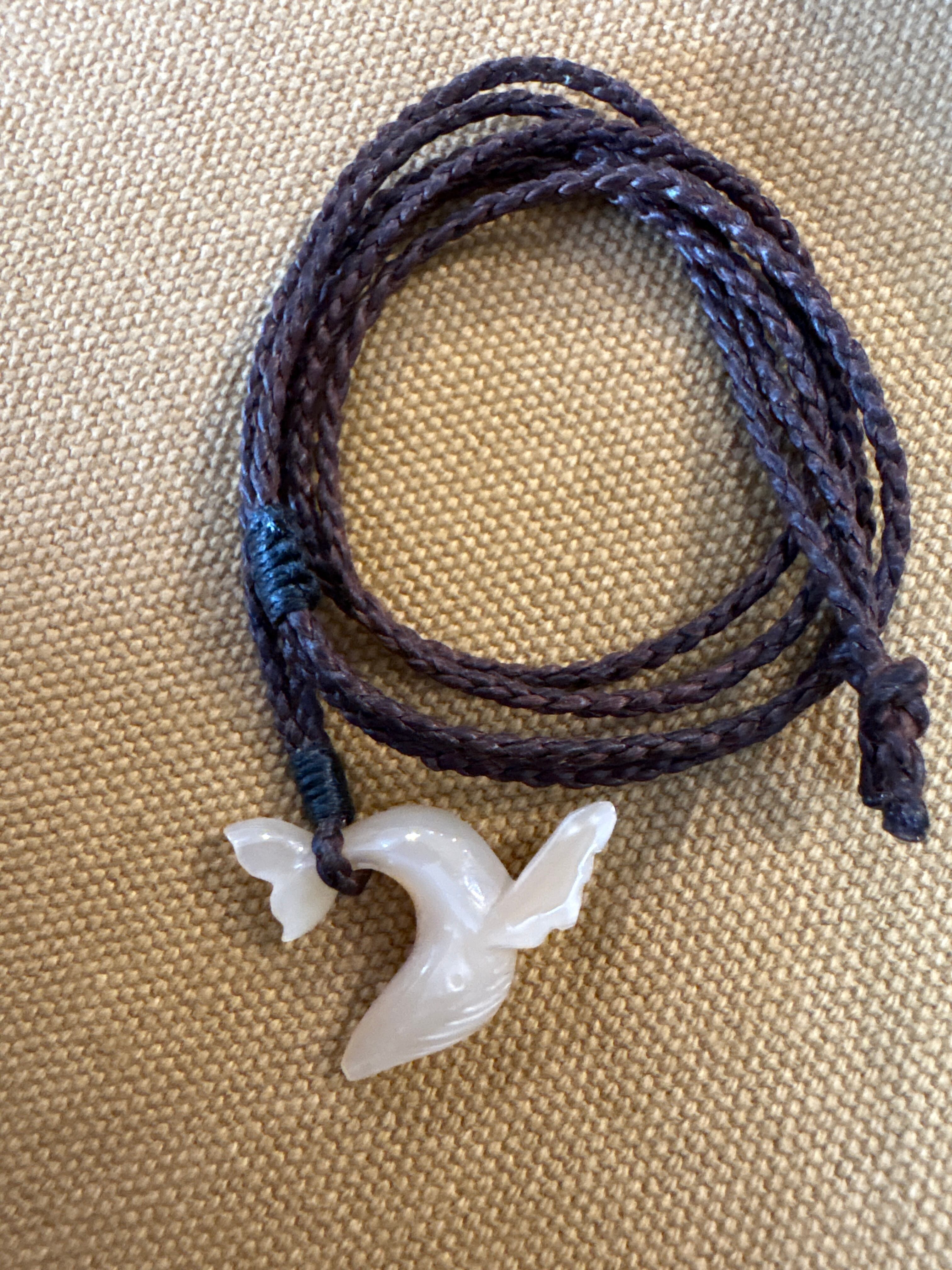高瀬貝は、沖縄の海で採れる貝の一種で、その美しい光沢と落ち着いた色合いが特徴です。古くから装飾品や工芸品に用いられ、自然の優雅さを感じさせる素材として親しまれています。このペンダントは、高瀬貝の輝きを活かしたクジラモチーフに、手編みのコゲ茶色4つ編み紐を組み合わせ、ナチュラルで温かみのあるデザインに仕上げました。長さは約80cmで調整可能なので、様々なスタイルに合わせてお使いいただけます。