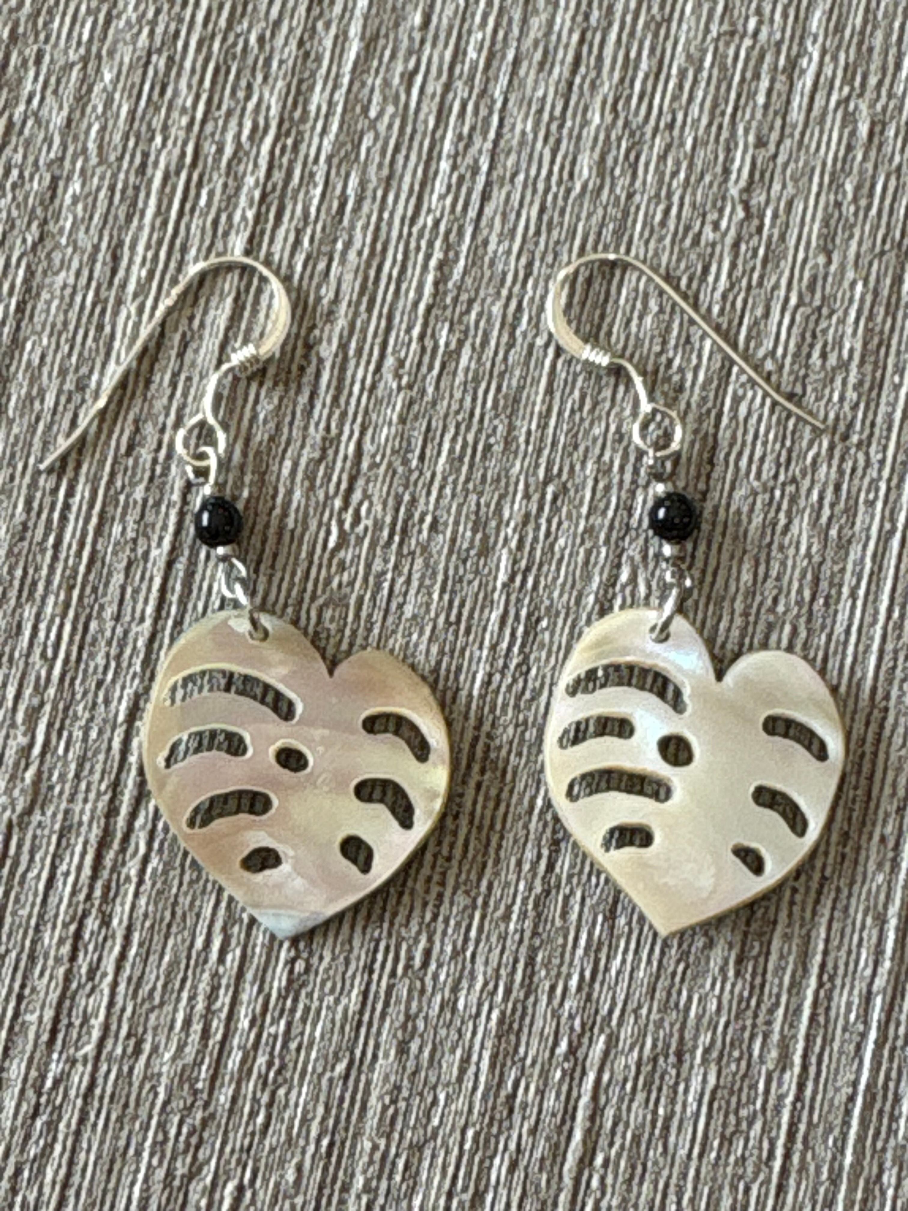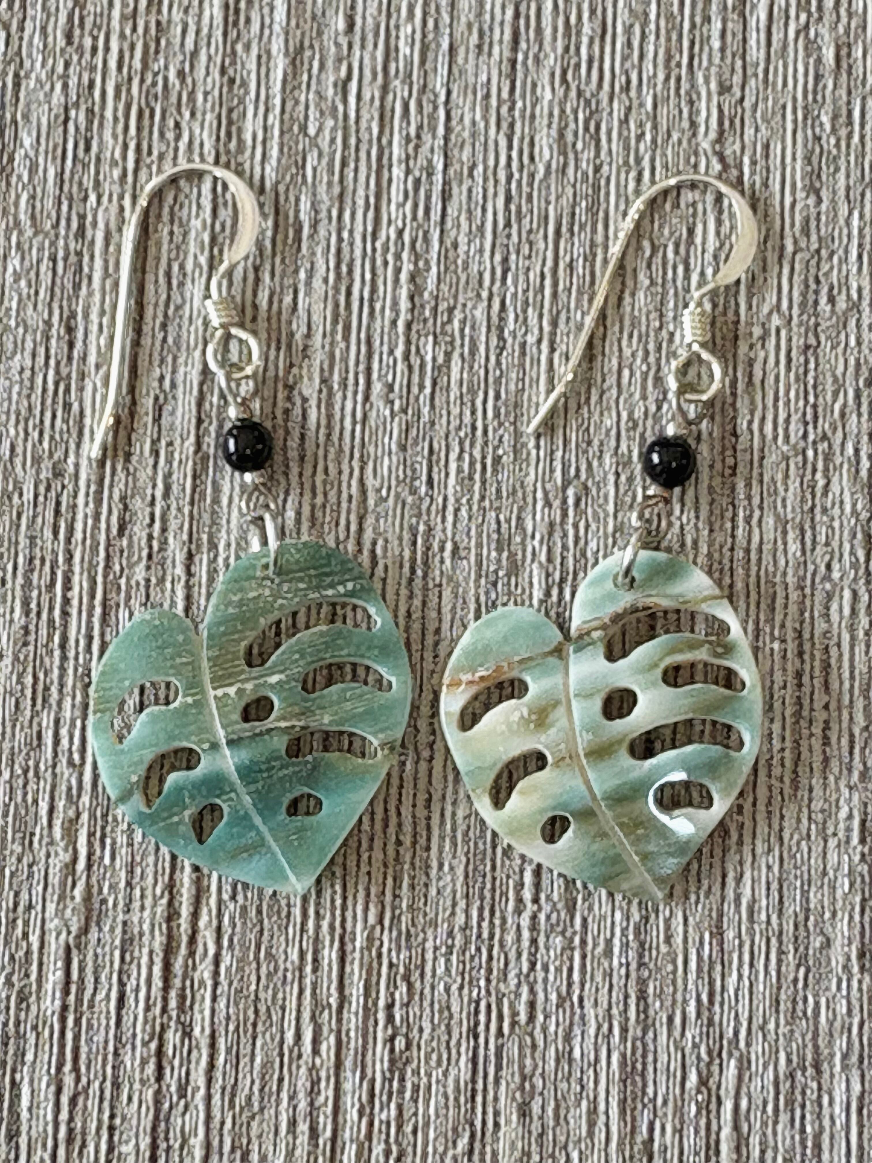 夜光貝の美しい輝きとブラックオニキスに組み合わさった、モンステラモチーフのピアスです。