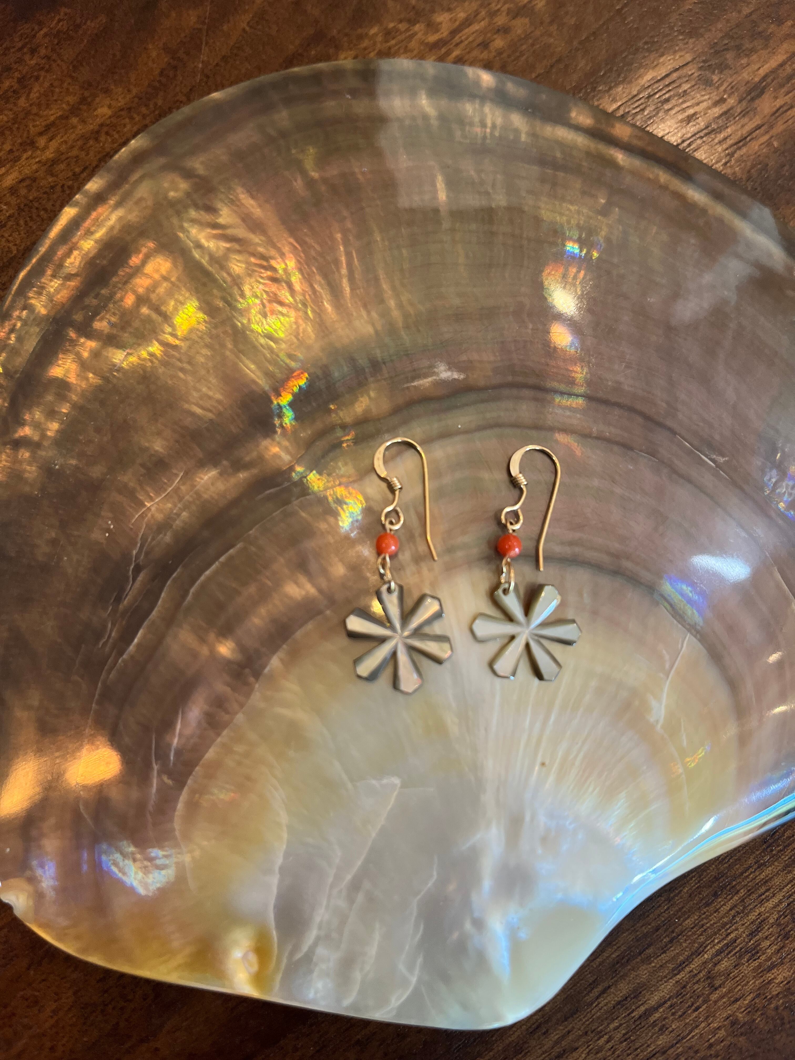 黒蝶貝を使用した美しい雪の結晶モチーフのピアスです。黒蝶貝の深い色合いが、雪の結晶の繊細さを際立たせます。ワンポイントに赤珊瑚をあしらい、華やかさをプラスしました。14金のピアスフックは上品で、どんなスタイルにもなじむデザインです。耳元で輝く美しさが、日常の装いに特別なアクセントをもたらします。