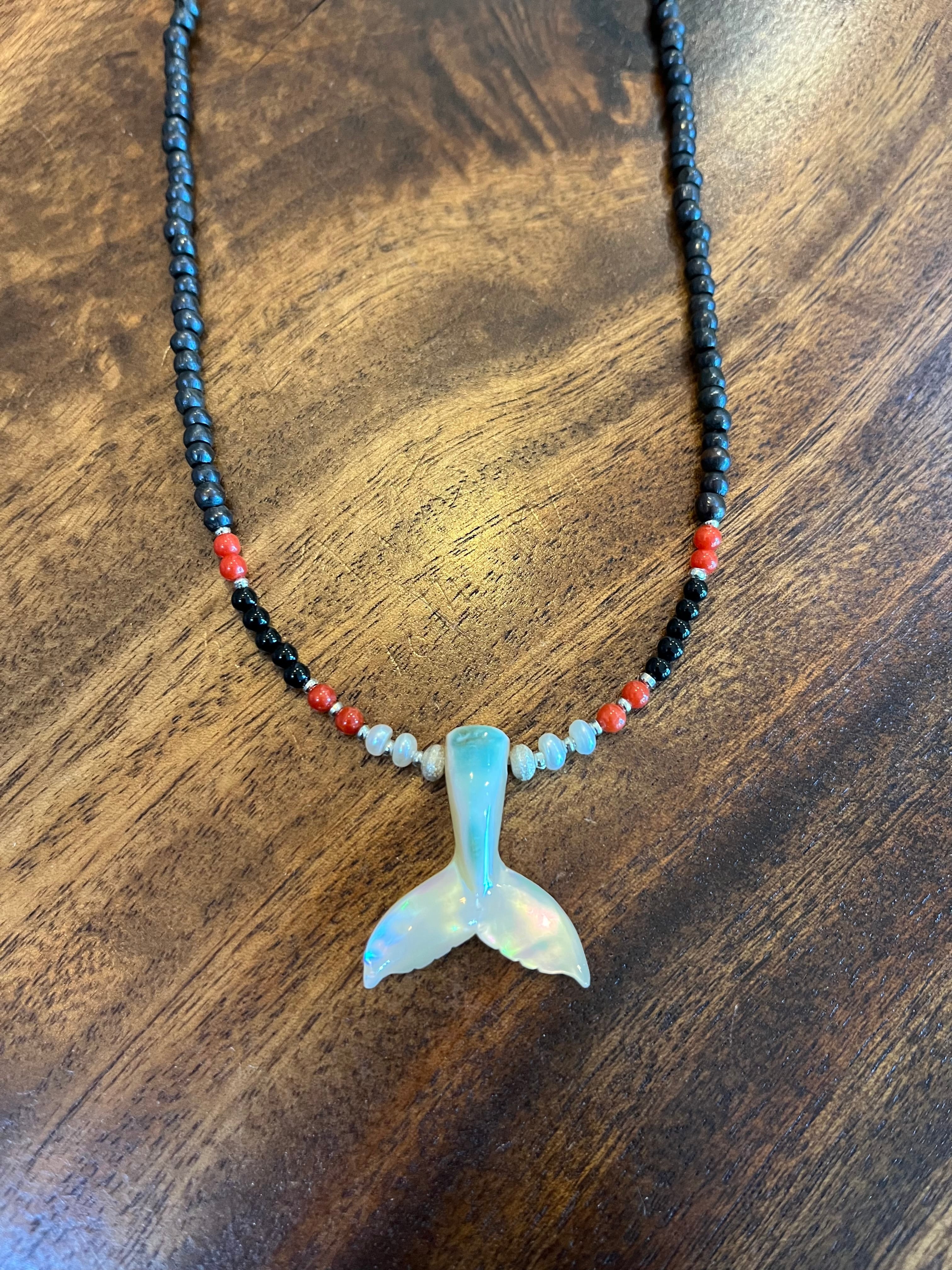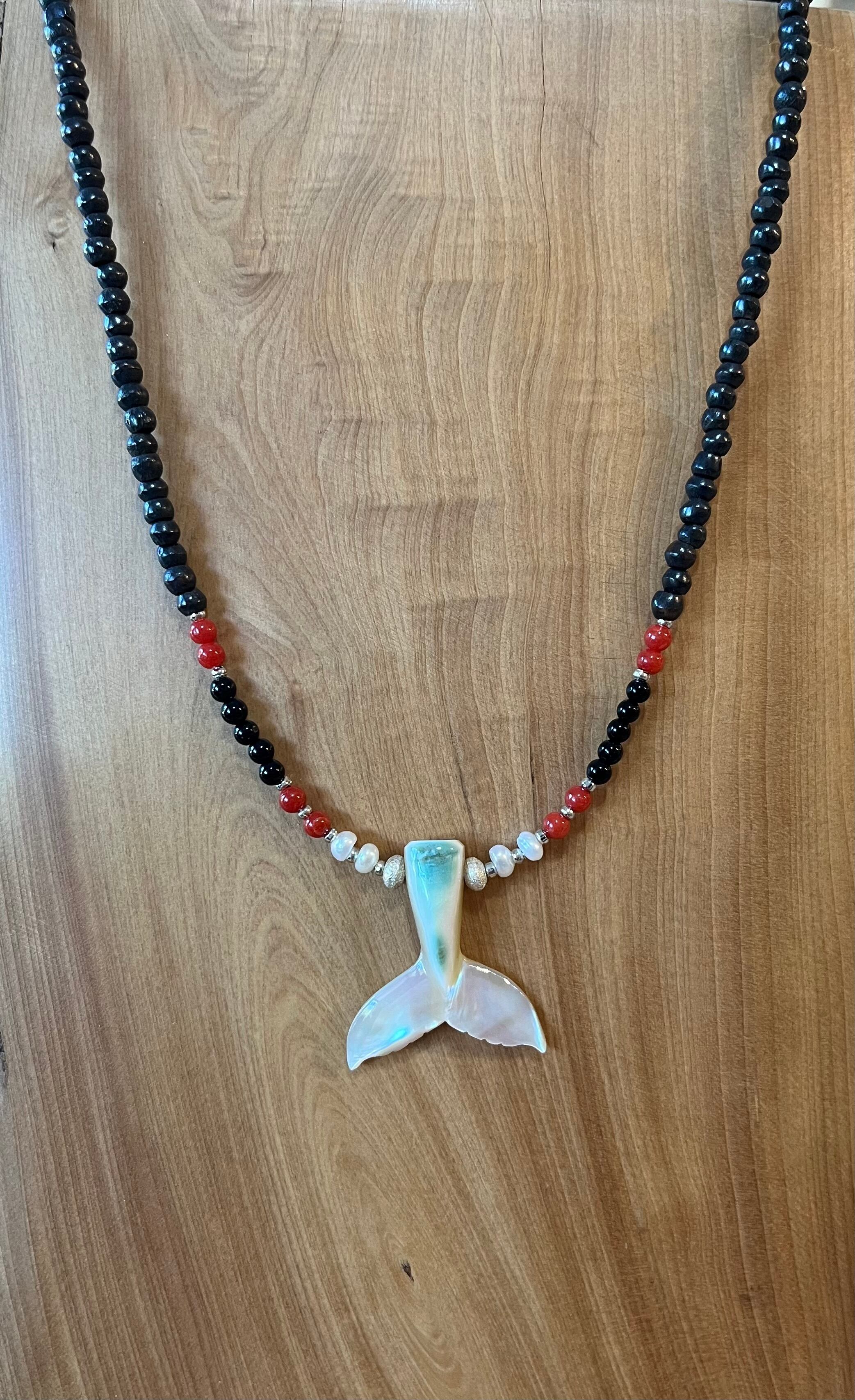夜光貝テールネックレス 夜光貝の持つ独特の光沢感が、テールの形状と調和し、見る人を魅了するデザインが特徴です。また、ブラックオニキスやシルバービーズ、淡水パール、赤珊瑚、ボーンビーズといった素材が織りなす色合いと質感が、あなたのスタイルを一層引き立てます。どんなシーンにもフィットするこのネックレスは、オリジナルのコーディネートにぴったりです!