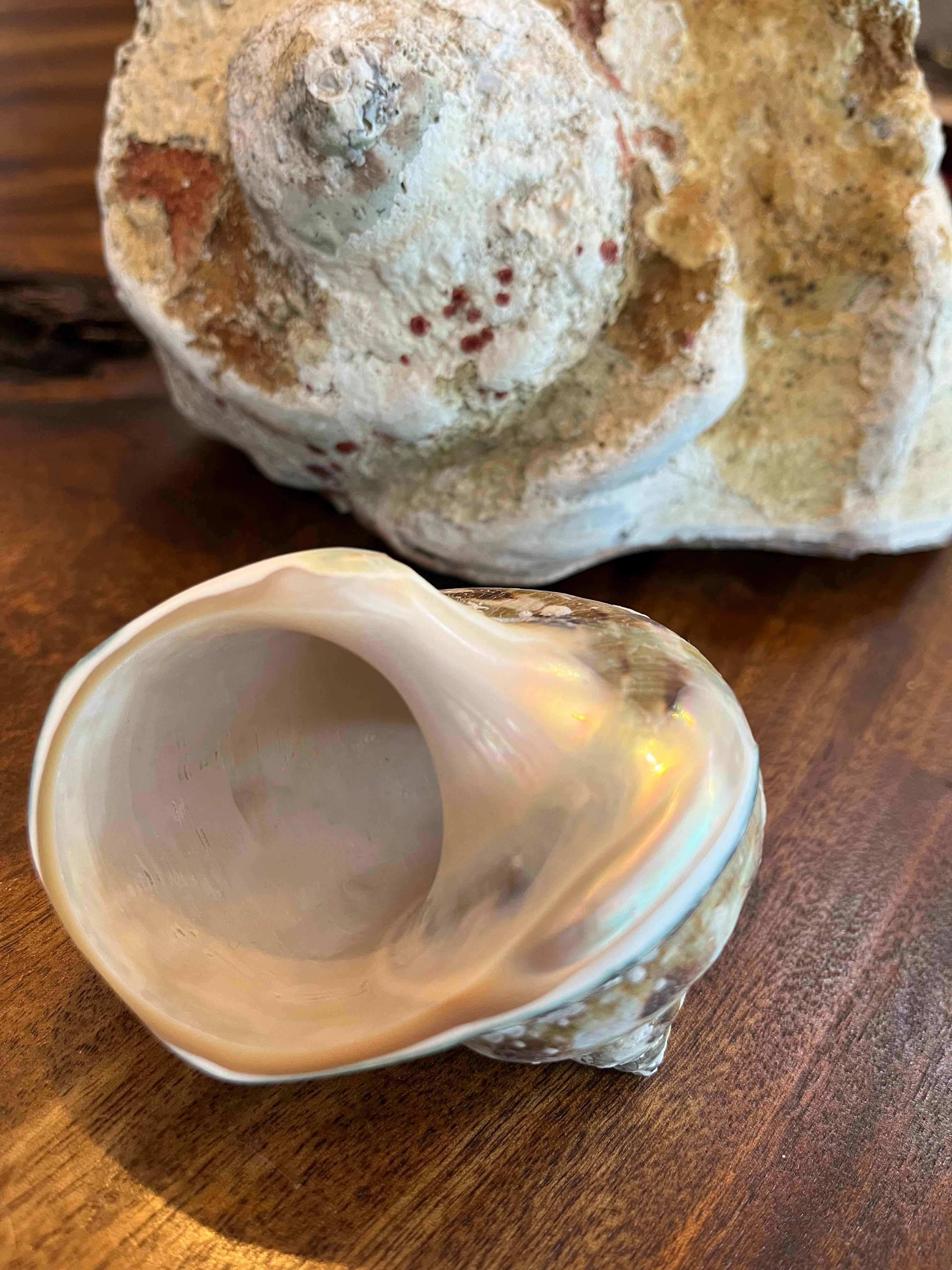 夜光貝ぐい呑み 夜光貝のトップ部分をカットしてぐい呑みに仕上げたこの商品は、まるで自然の芸術品のようです。お酒を楽しむ時間が、よりおしゃれで特別なひとときに変わることでしょう。