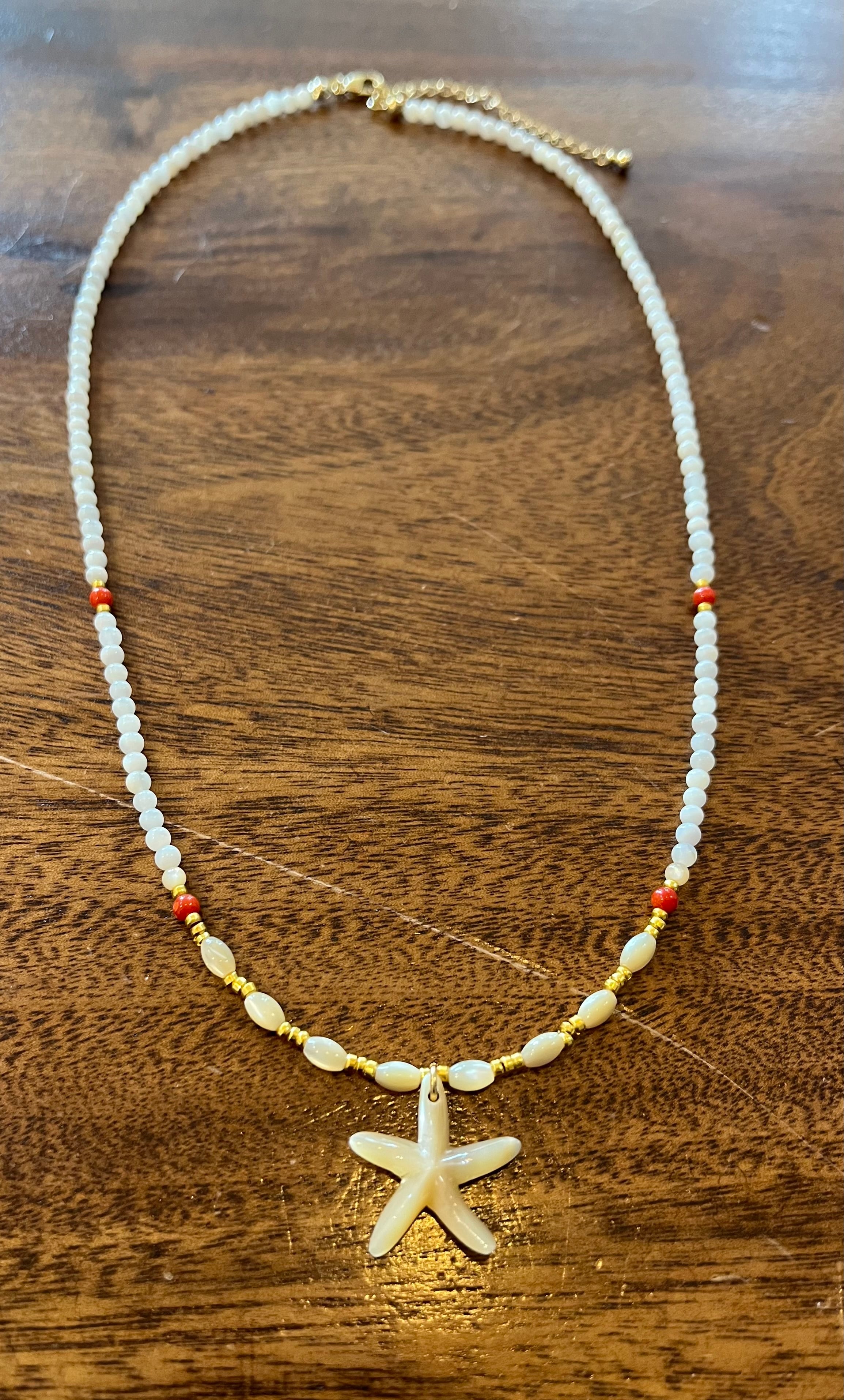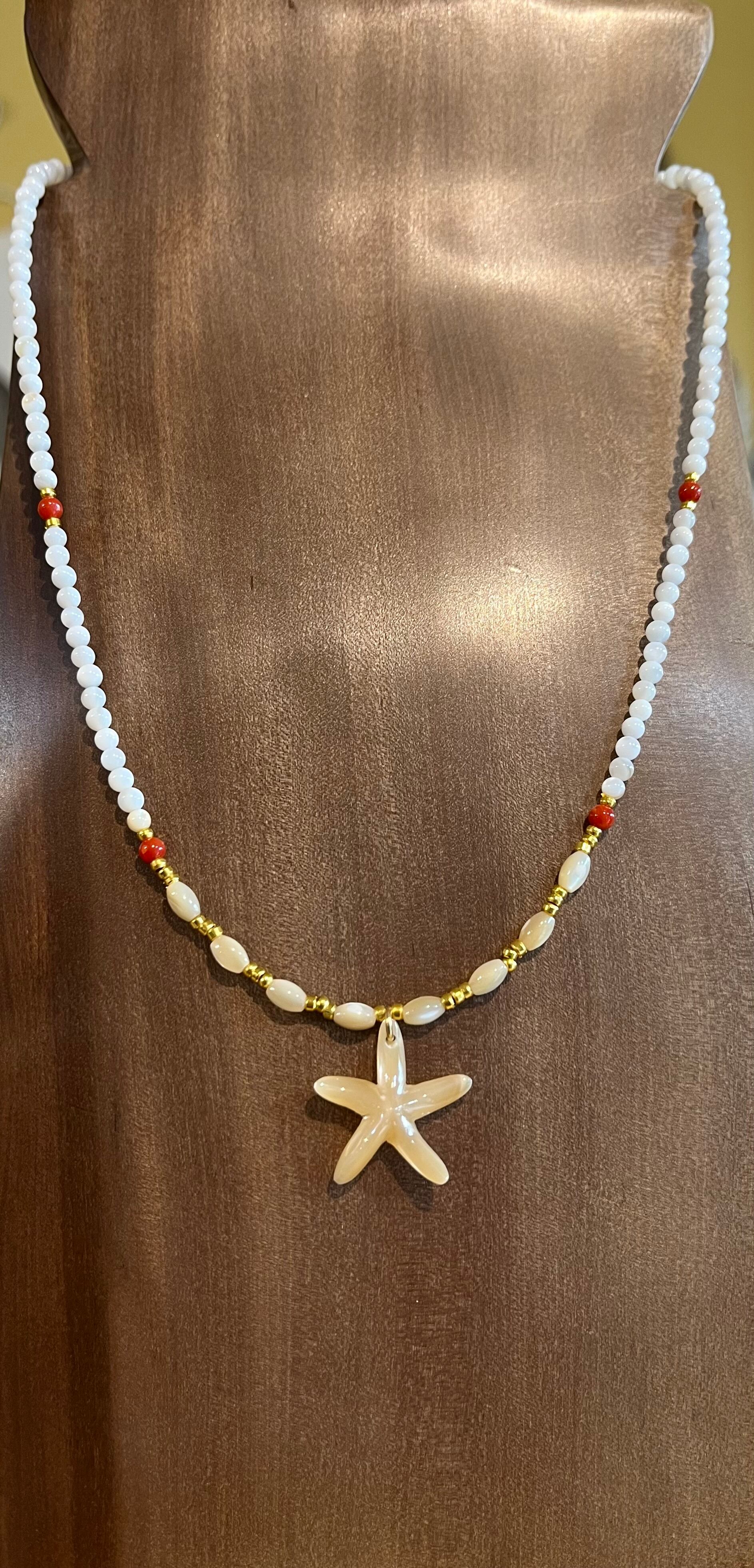 高瀬貝ヒトデネックレス 高瀬貝を使用し、ヒトデの魅力を引き出したデザインのネックレスです。赤珊瑚と真鍮ビーズとの色合いが絶妙に調和し、あなたのスタイルを一層引き立てます。特別な日のコーディネートにも、普段使いにもぴったりなアイテムです!