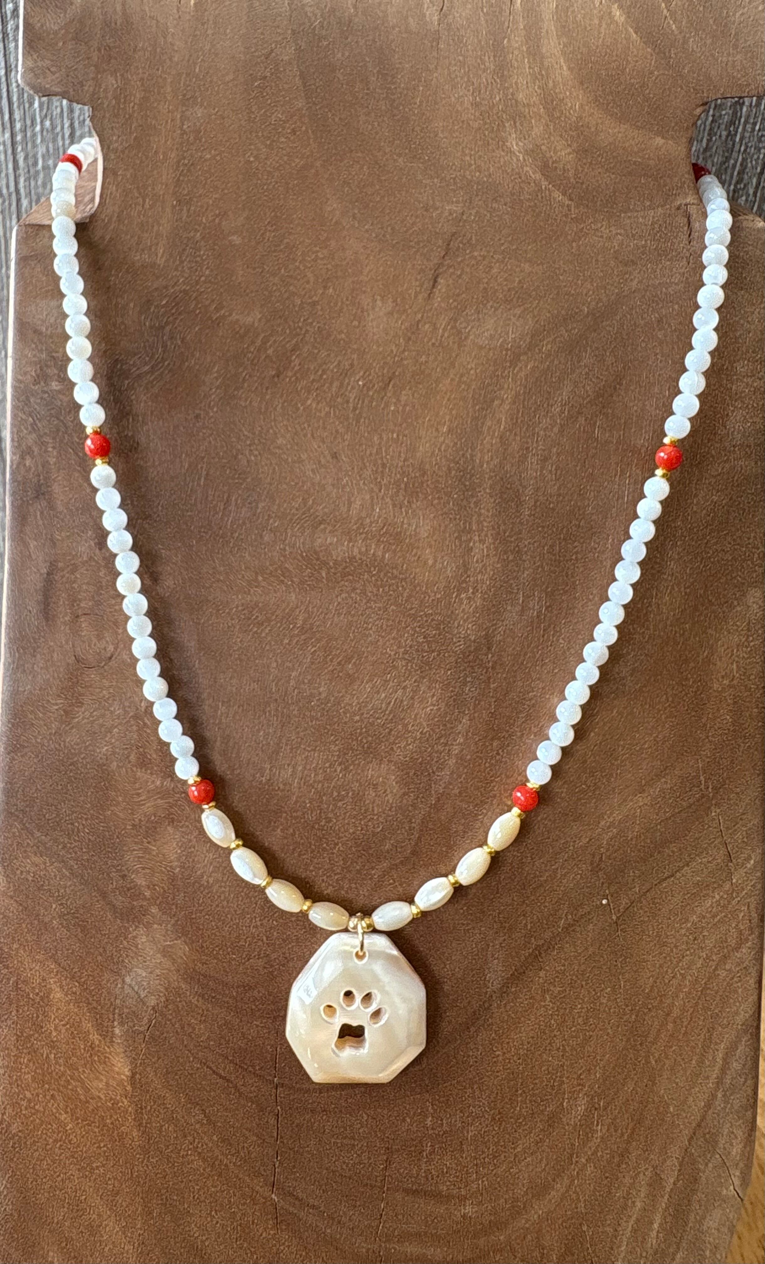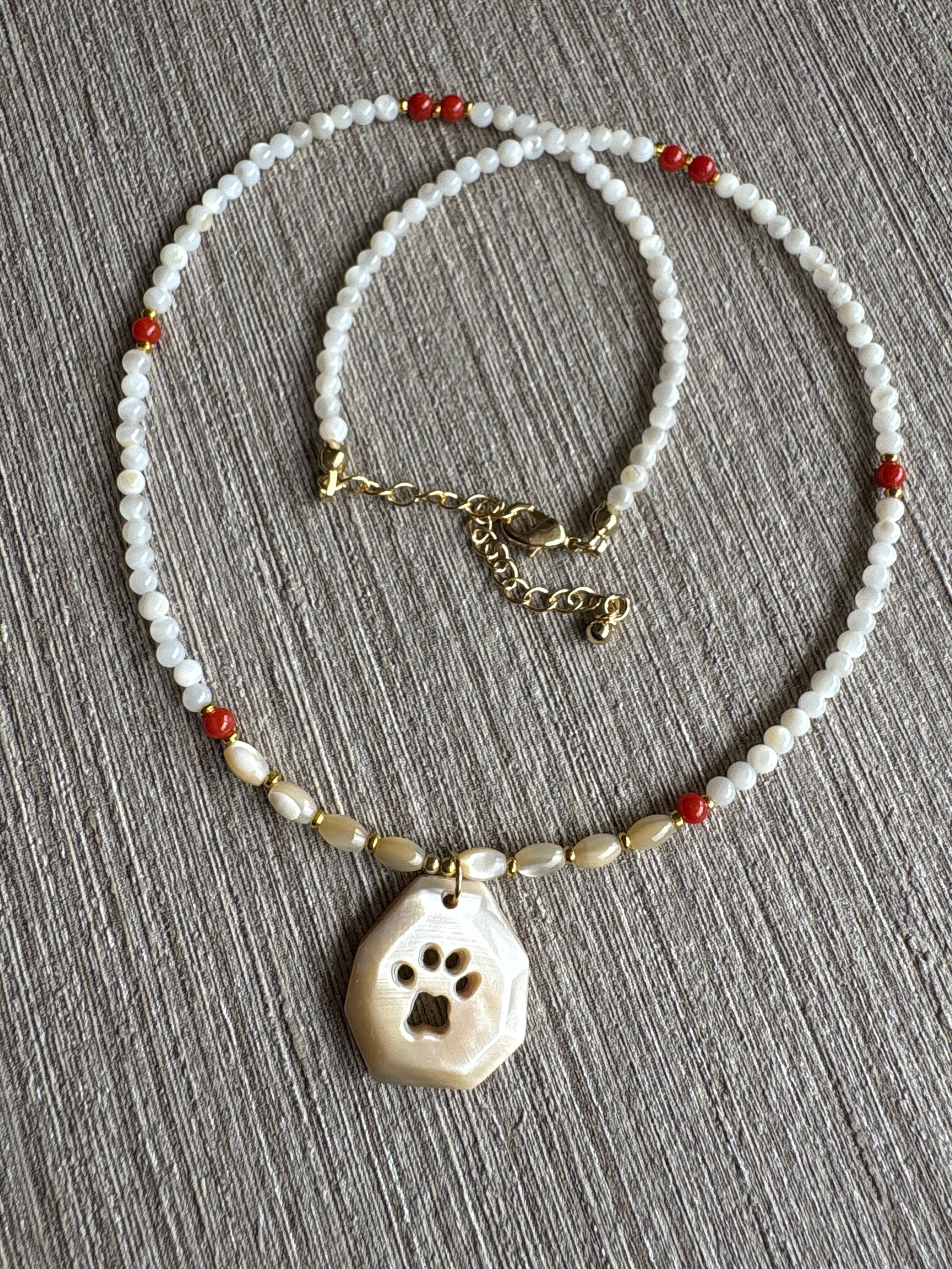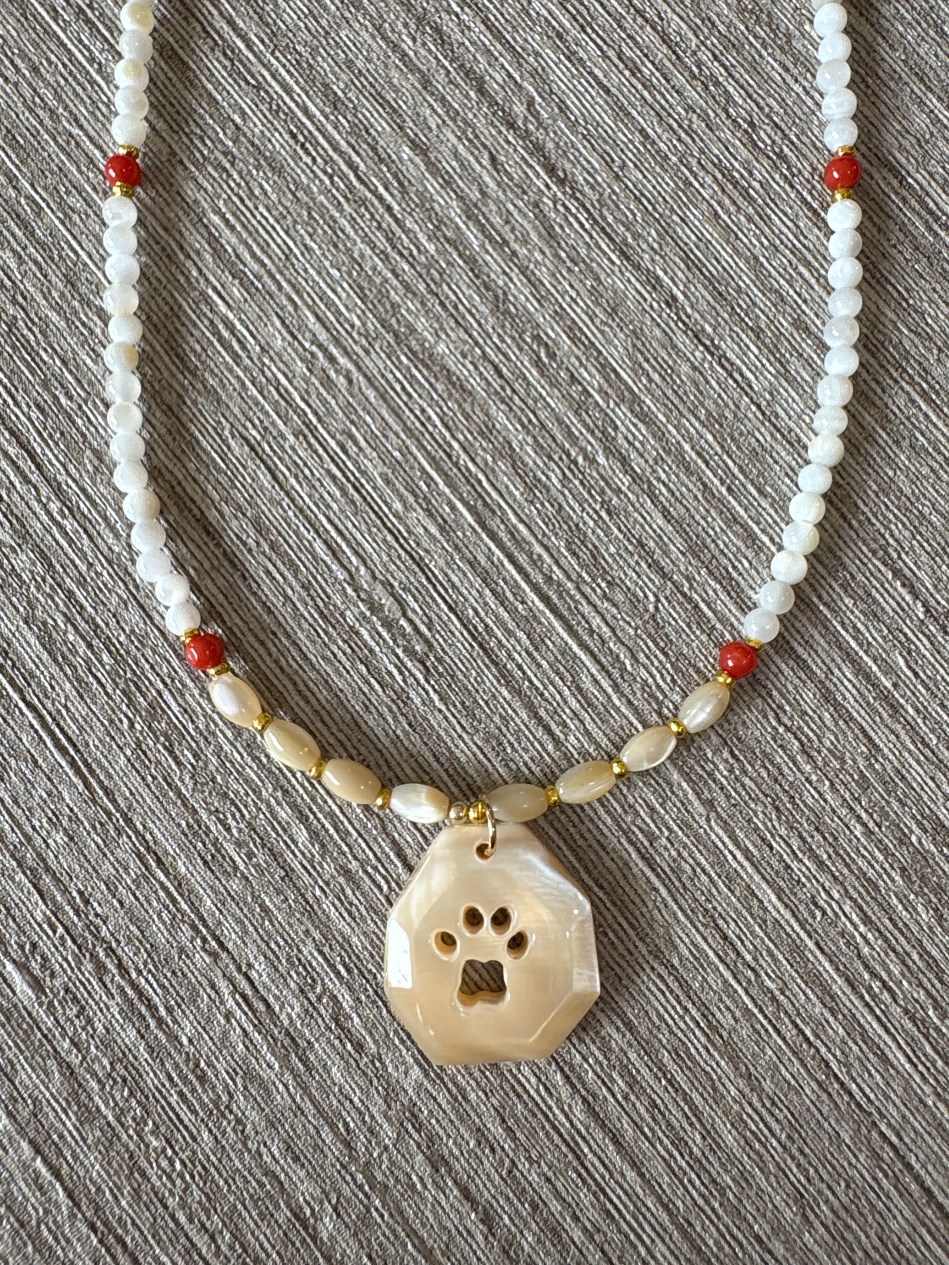 高瀬貝を使用し、ヤマネコの足あとをおしゃれにデザインしたネックレスです。赤珊瑚とシェルビーズとの色合いが絶妙に調和し、あなたのスタイルを一層引き立てます。普段使いにもぴったりなアイテムです!