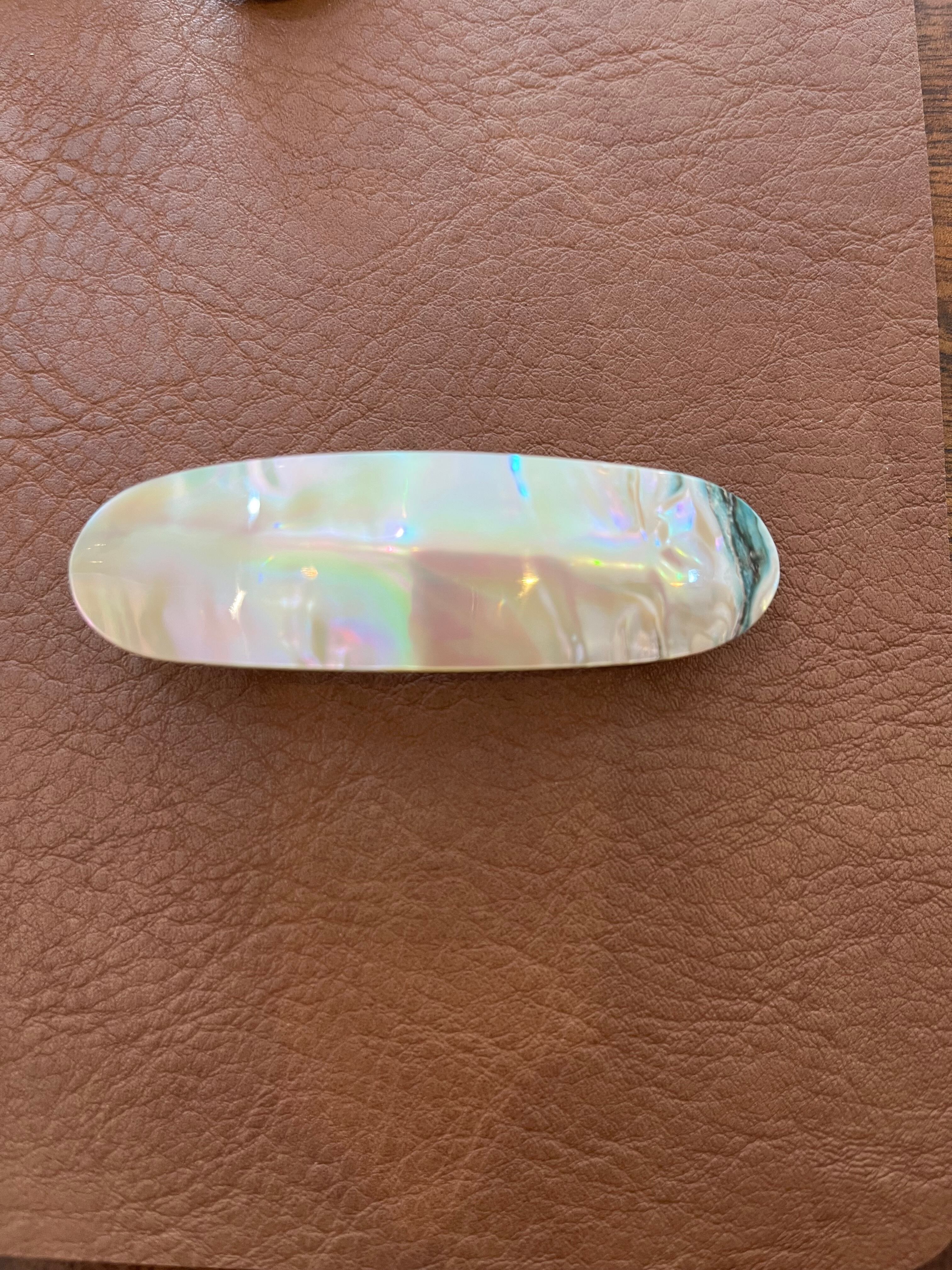 夜光貝バレッタ 夜光貝の持つ自然な真珠層が美しく際立つ、エレガントなデザインのバレッタです。控えめなグリーンのアクセントがあり、スタイルに華やかさを加えてくれるアイテムです!日常使いから特別なシーンまで幅広くお使いいただけます。