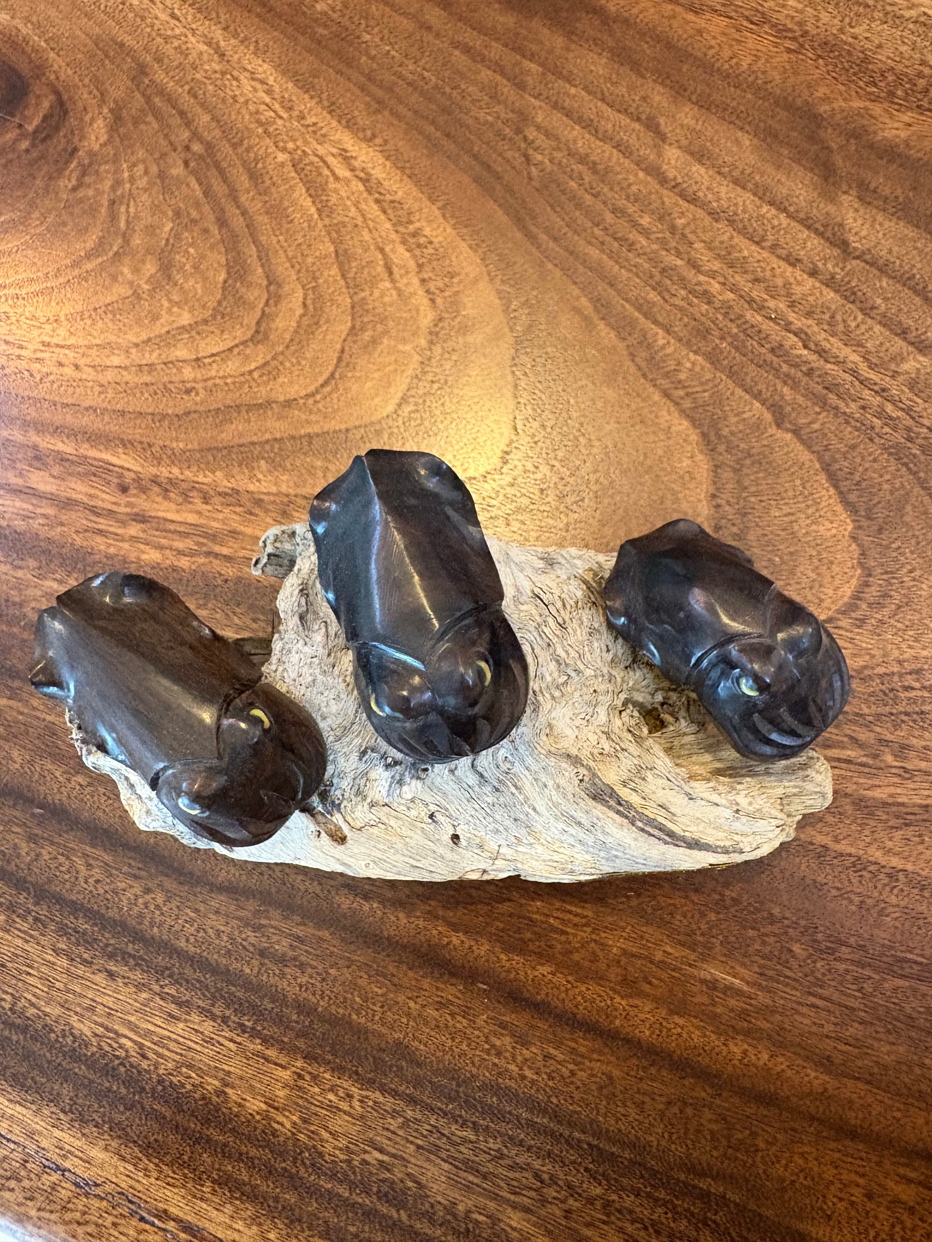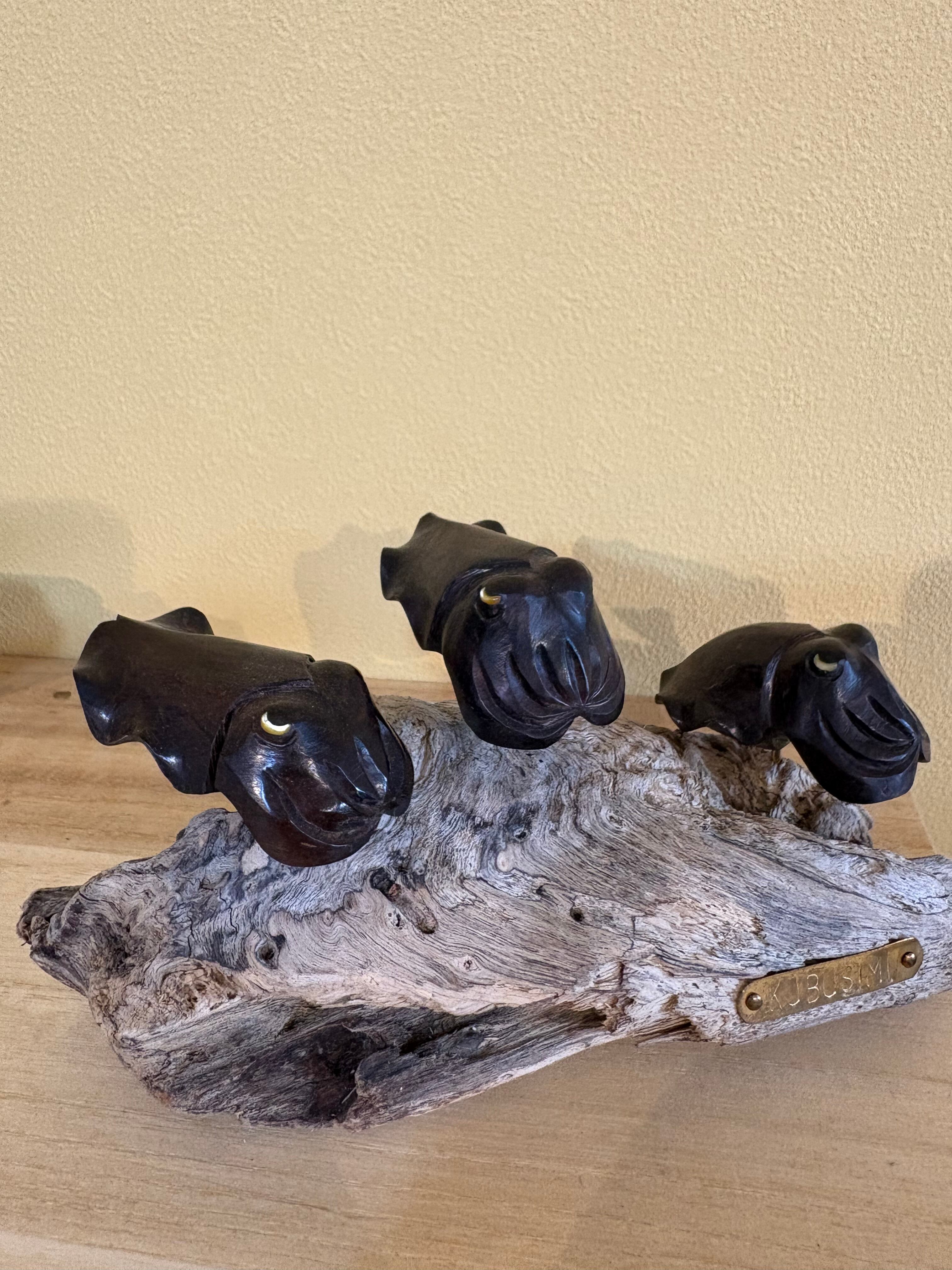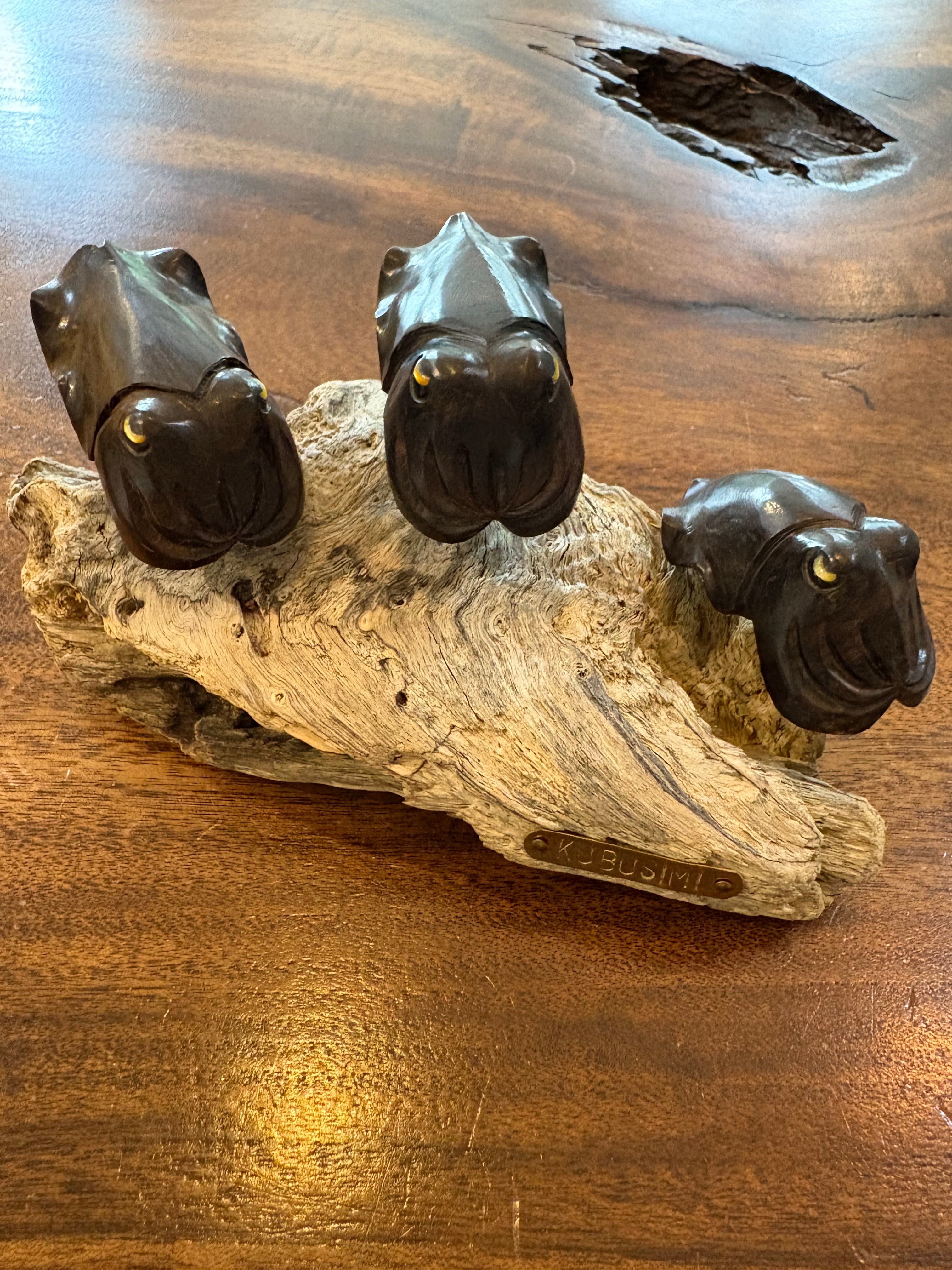 黒檀の重厚感ある質感と白蝶貝の目が印象的なクブシミのオブジェです。台座には自然の流木を使用し、沖縄の海と森を感じさせる一品。お部屋やオフィスのインテリアとしてもおすすめです。 オブジェの高さ:6、5㎝×14㎝ 流木の大きさ:14㎝×8㎝ 黒檀クブシミ:6㎝×3㎝ 3匹 クブシミの目:白蝶貝