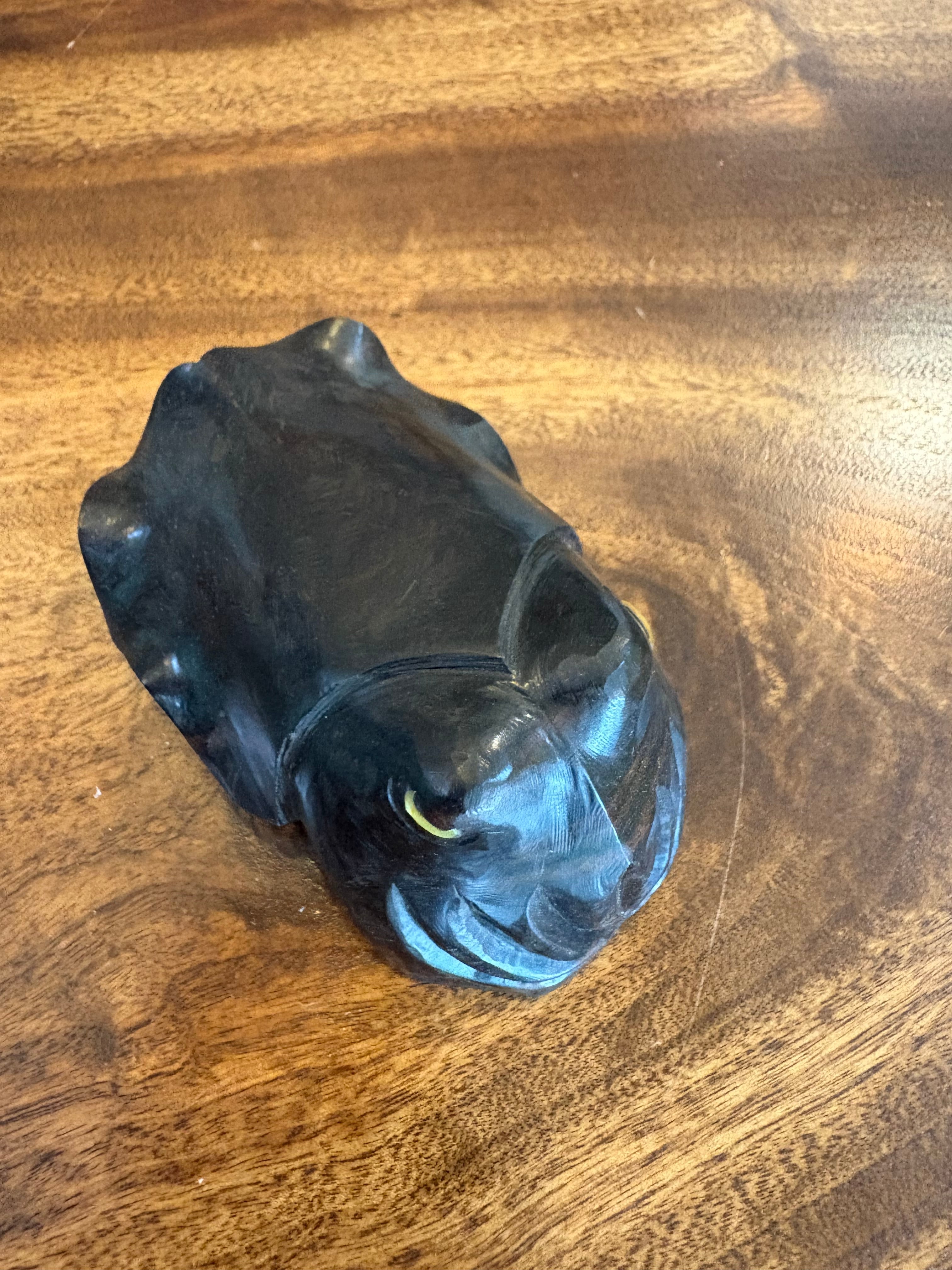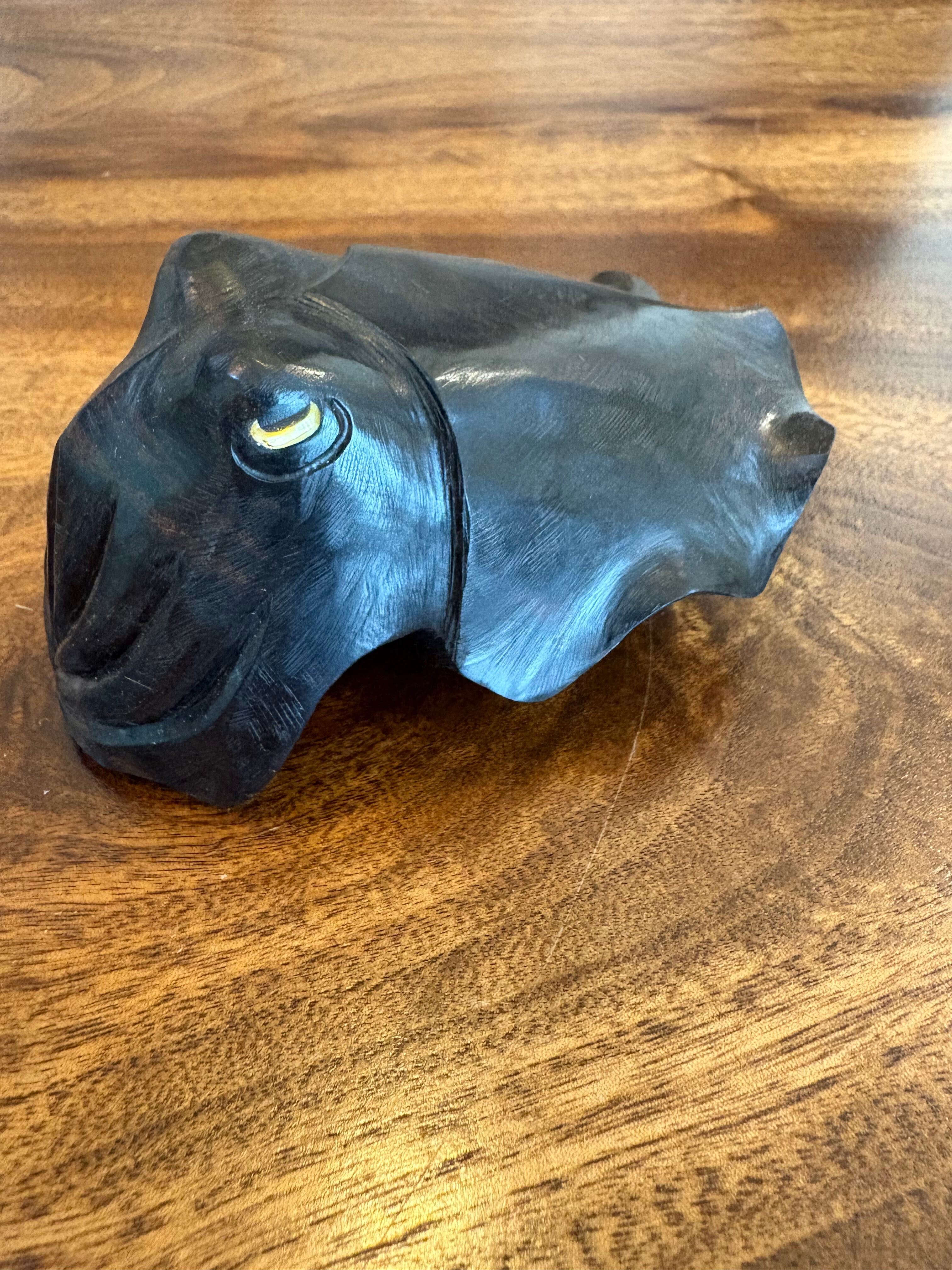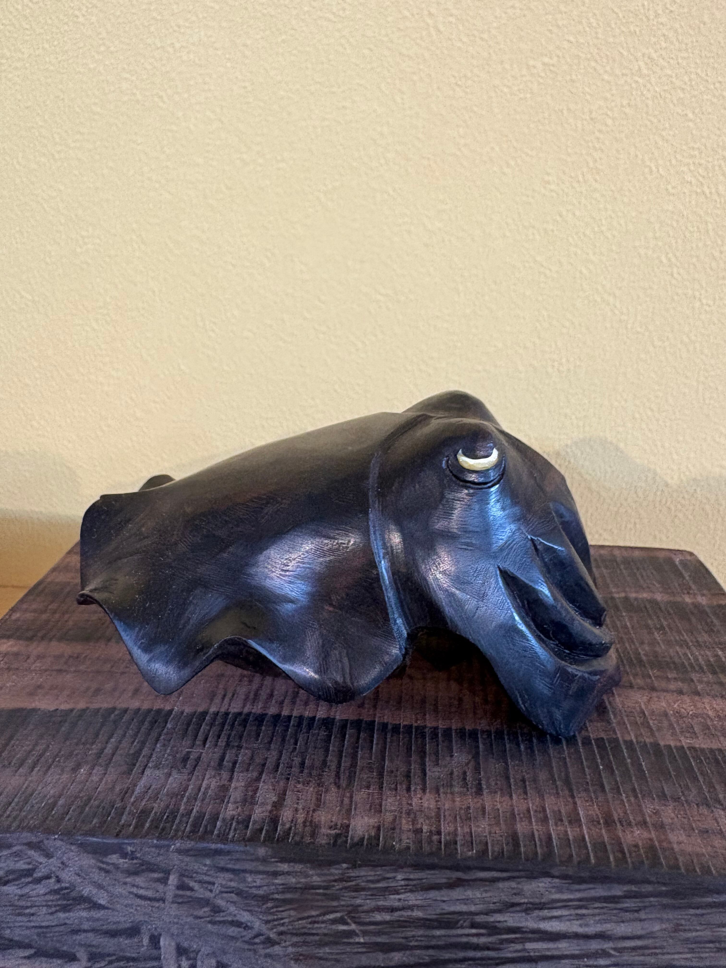 黒檀で作られたクブシミのオブジェです。目には白蝶貝を使用し、まるで海で優雅に泳いでいるかのような姿が特徴的です。台座がないため、どんな場所でも使いやすく、シンプルで洗練されたデザインが魅力となっています。お部屋やオフィスのインテリアとして、また贈り物にも最適です。黒檀の重厚感と白蝶貝の輝きが、あなたの空間に特別な雰囲気を加えてくれることでしょう。