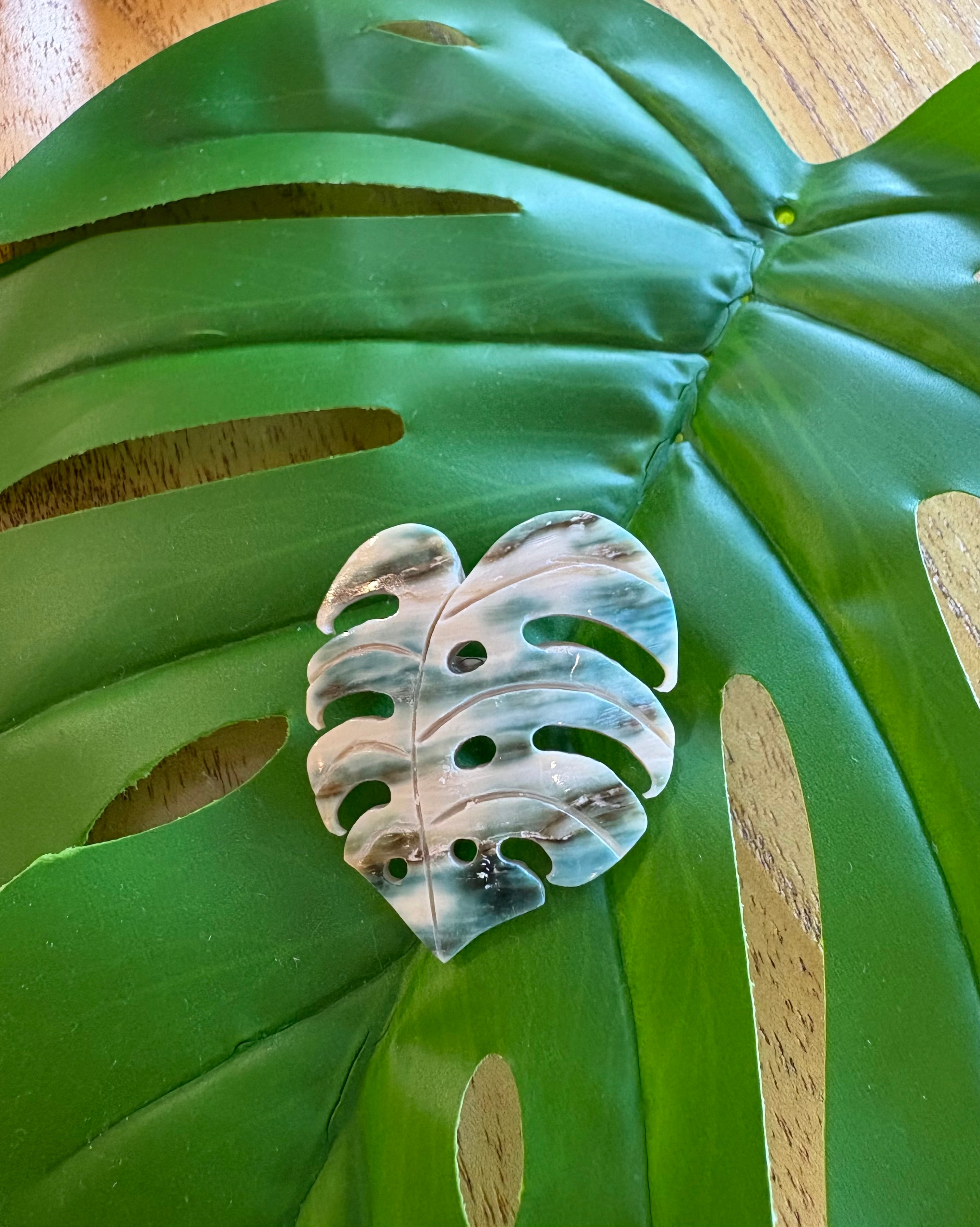 夜光貝モンステラブローチです。美しい夜光貝を使用して作られたモンステラのデザインは、これからの季節にぴったりなアイテムです。グリーンの色合いがモンステラの特長を引き立て、シンプルながらも存在感のあるアクセントを実現しています。