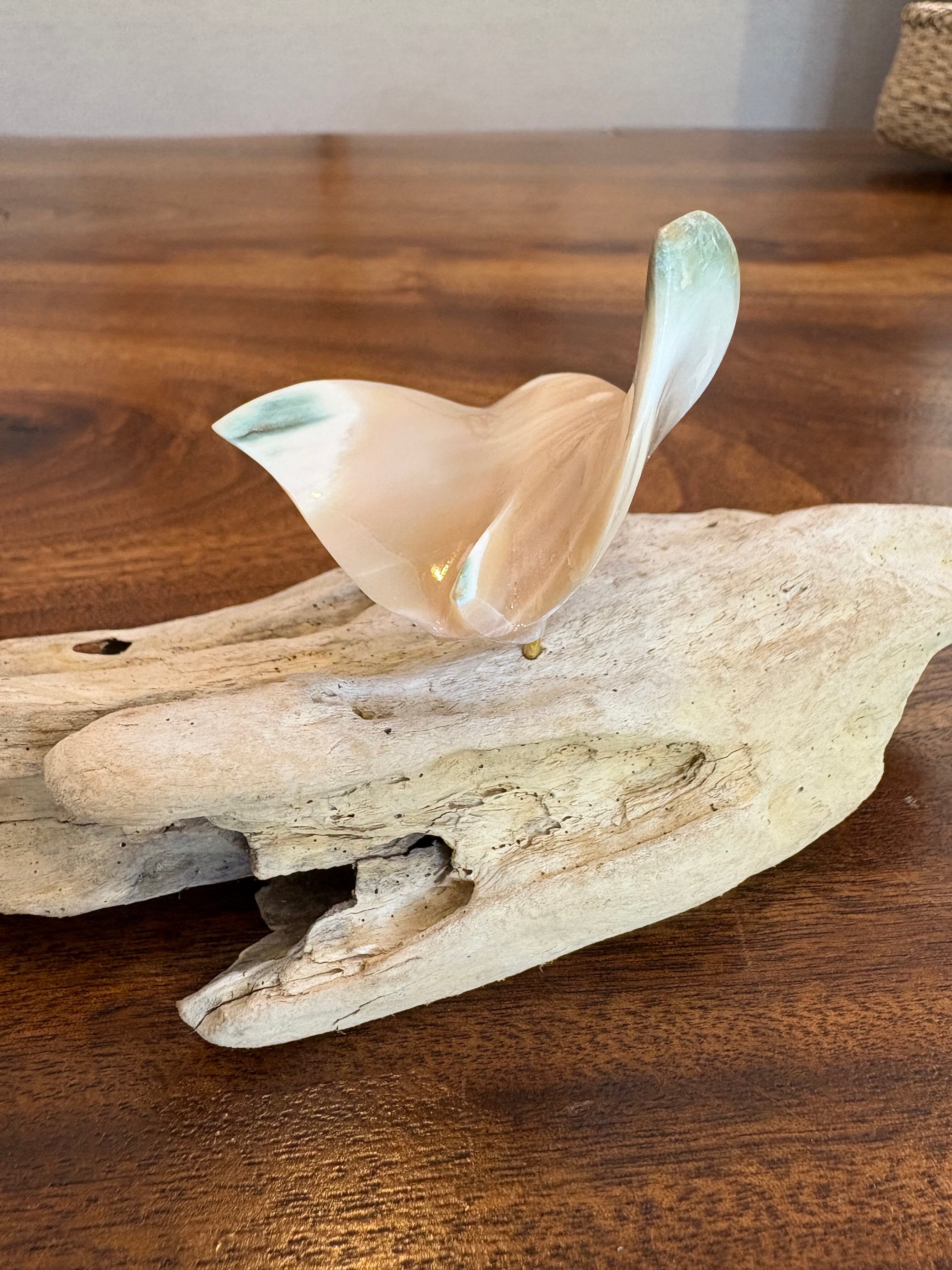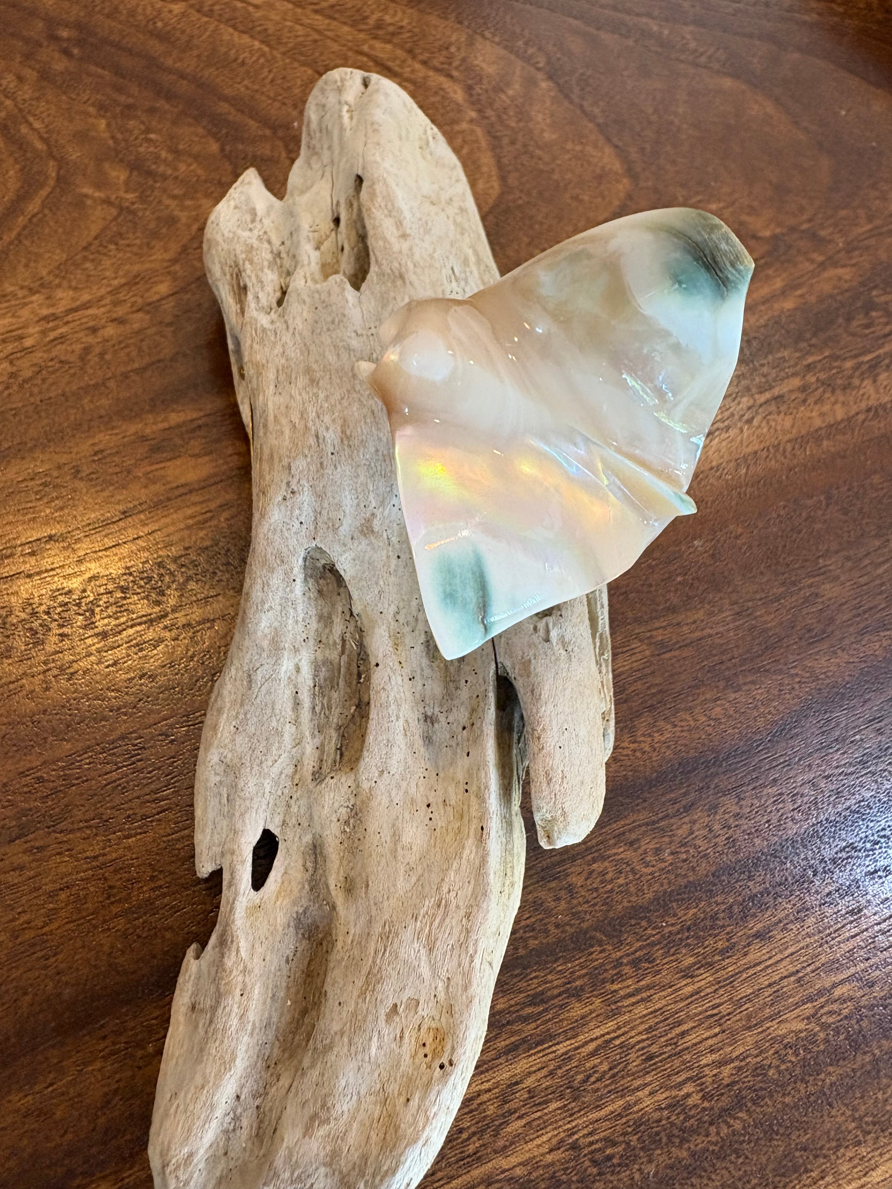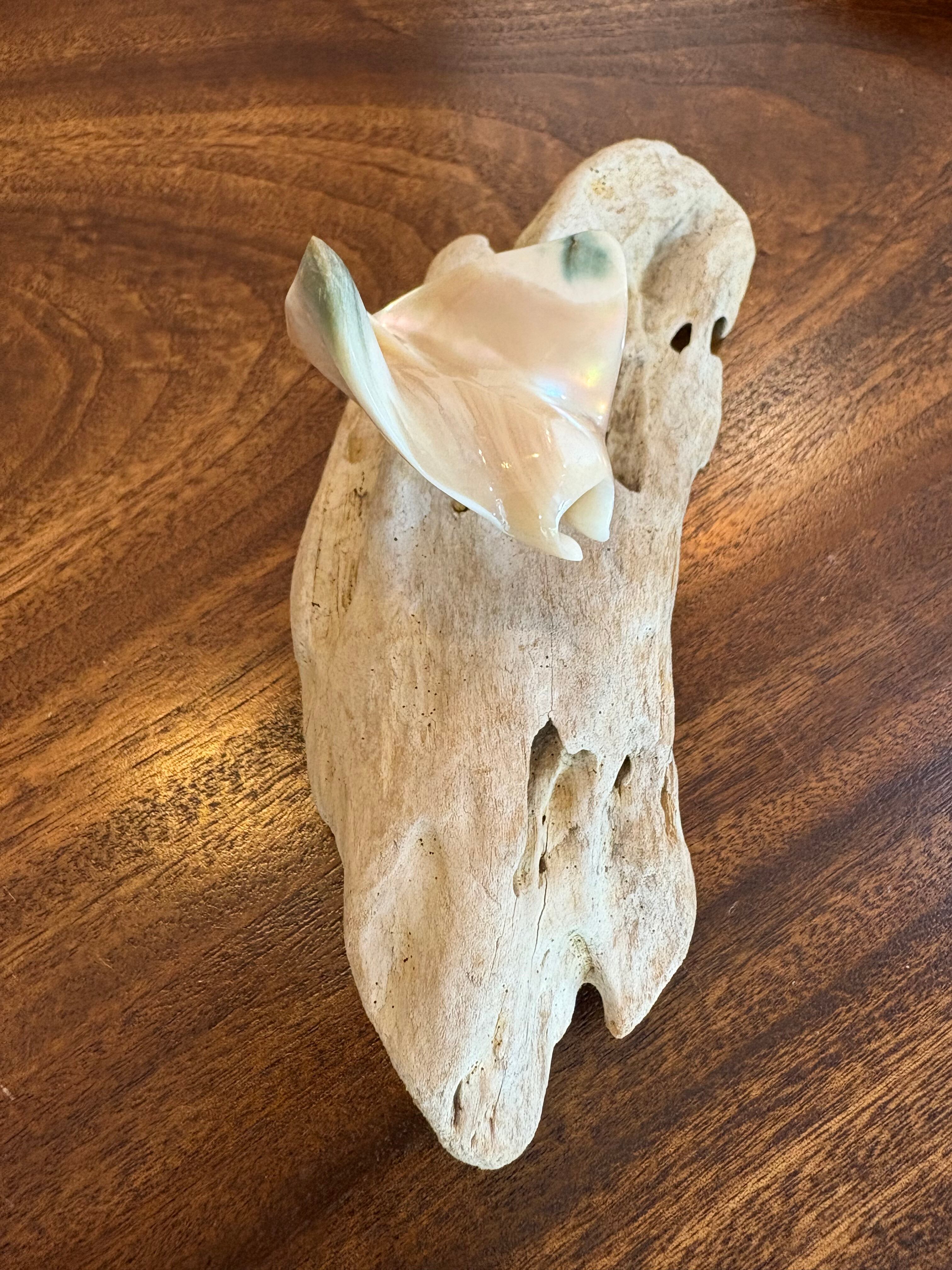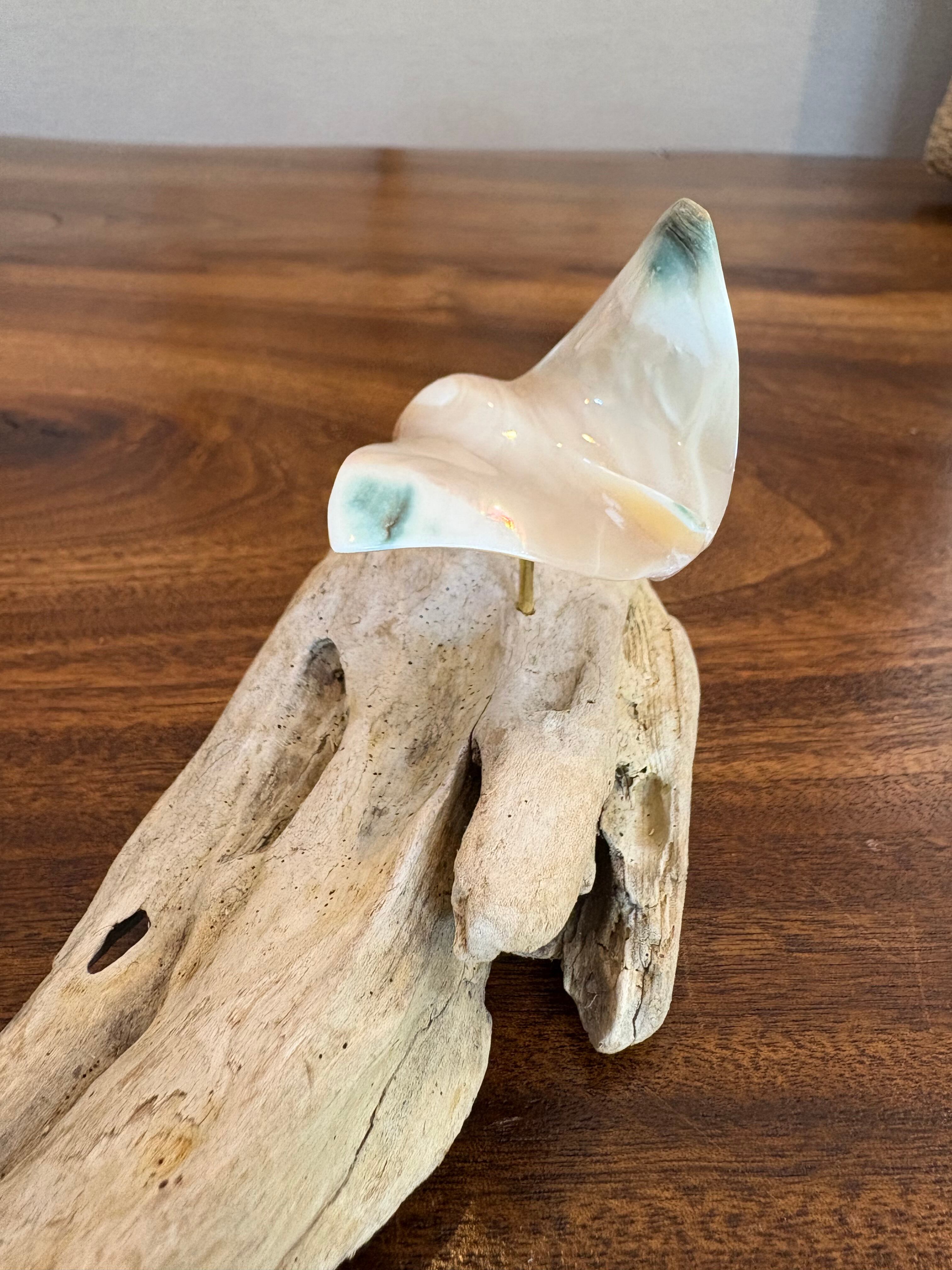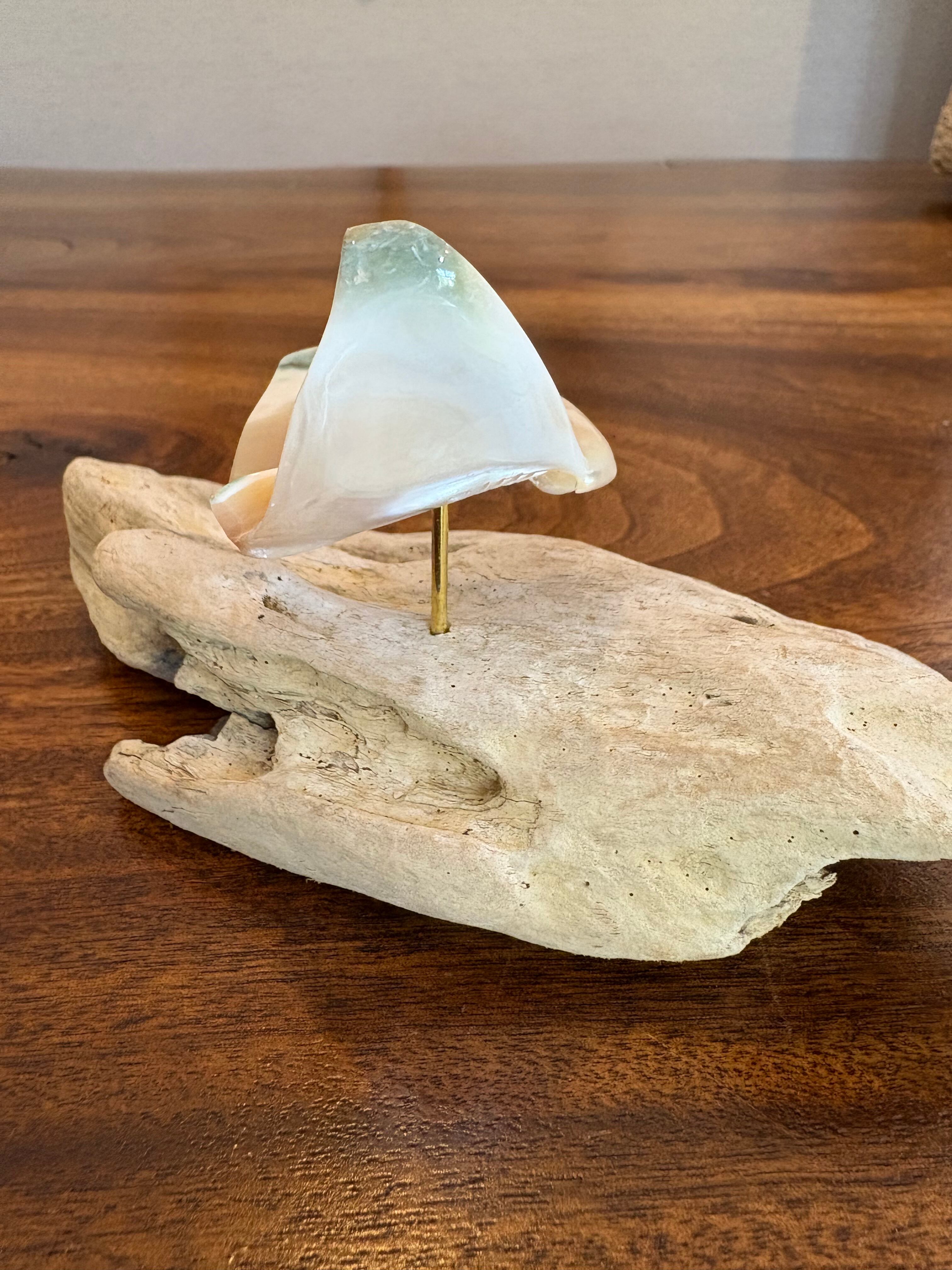 台座には自然の形を活かした流木を使用し、海の風景をそのまま切り取ったような、ぬくもりある佇まいに仕上がっています。