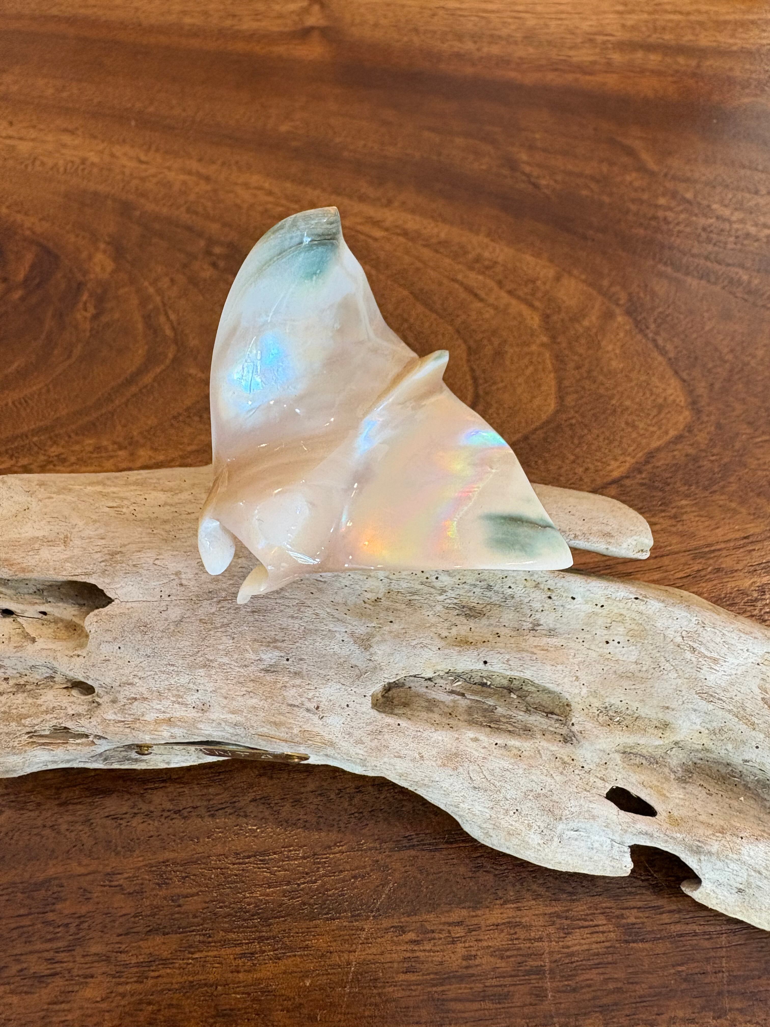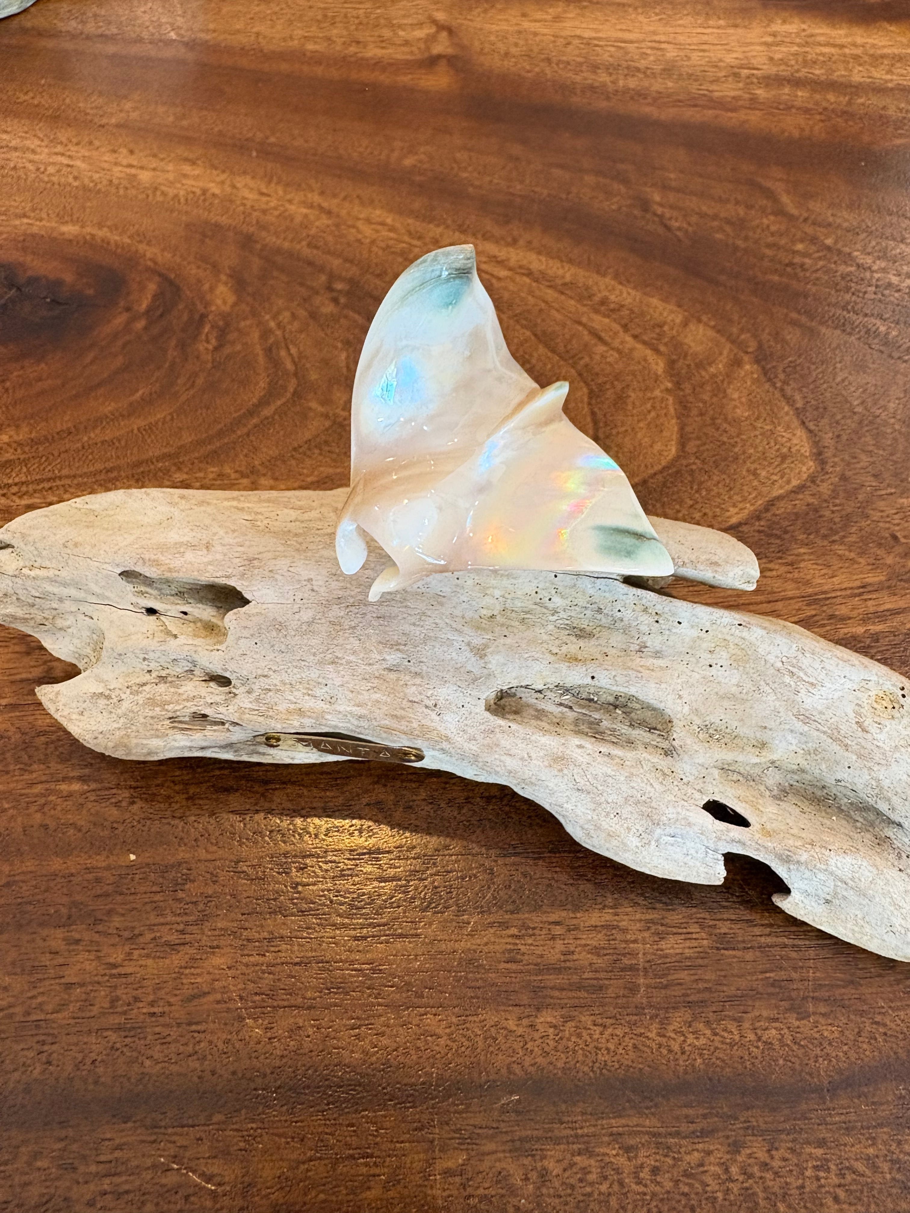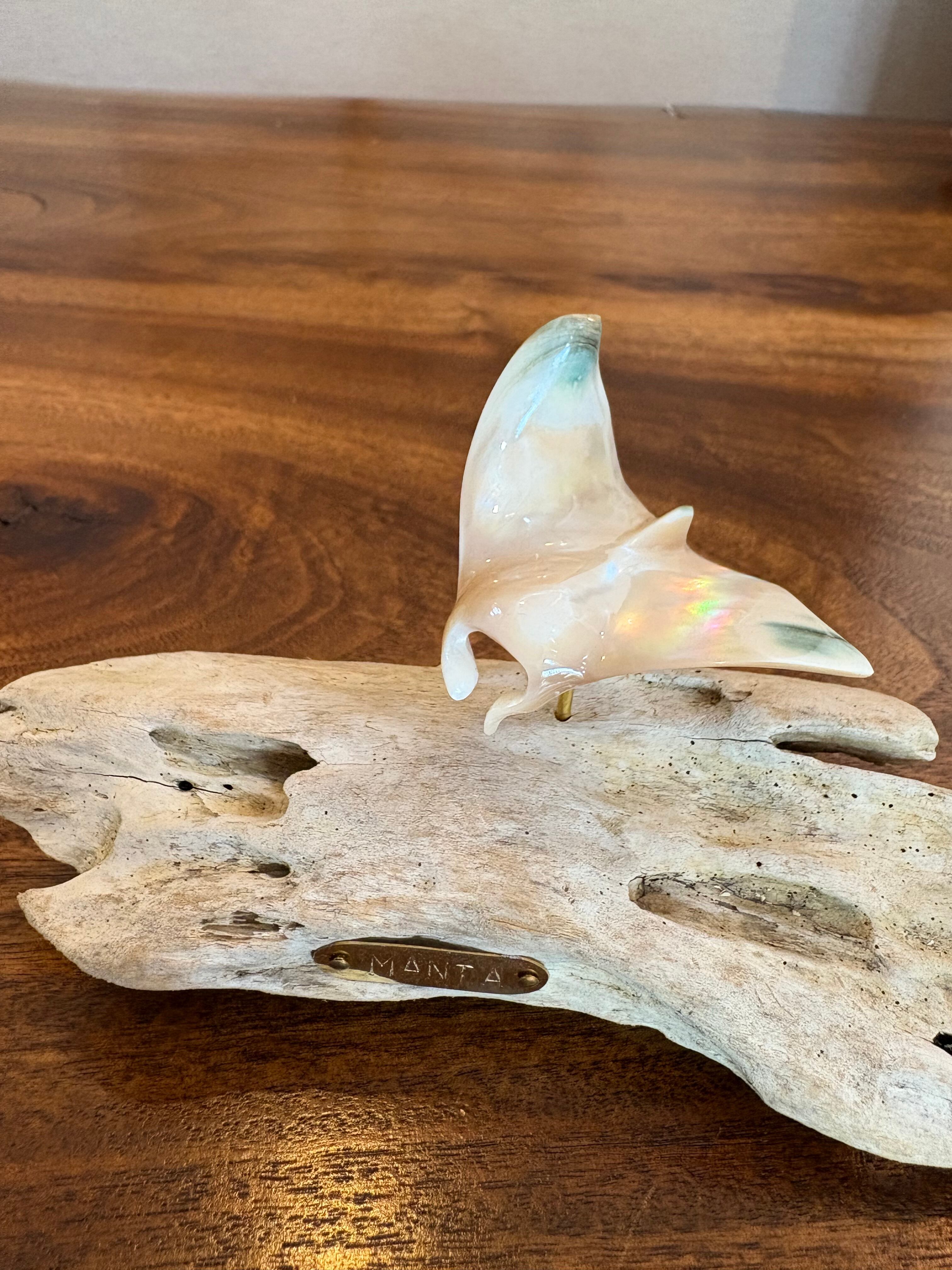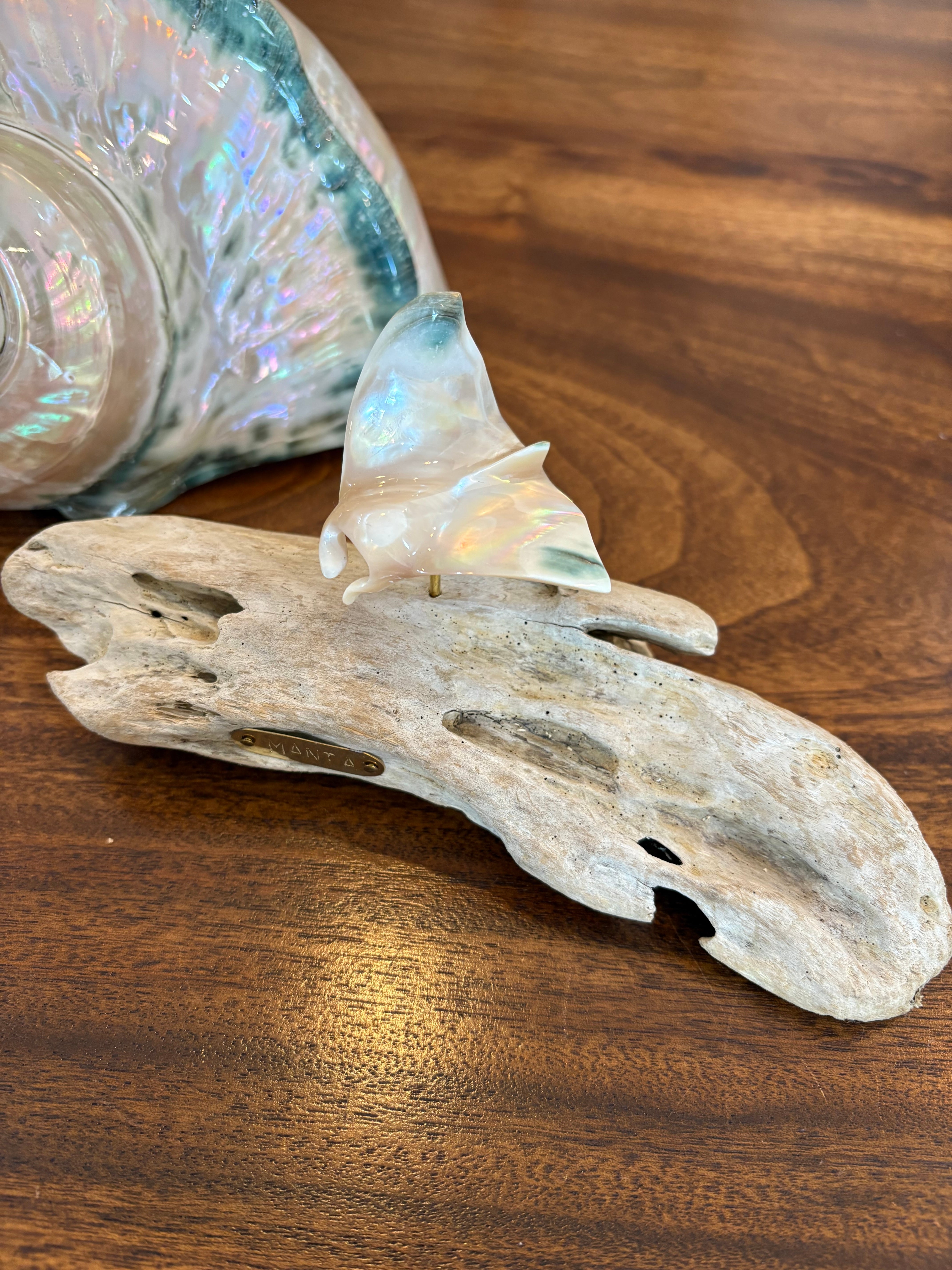 夜光貝の神秘的な輝きと、沖縄の海を悠々と泳ぐマンタをモチーフにしたオブジェです。