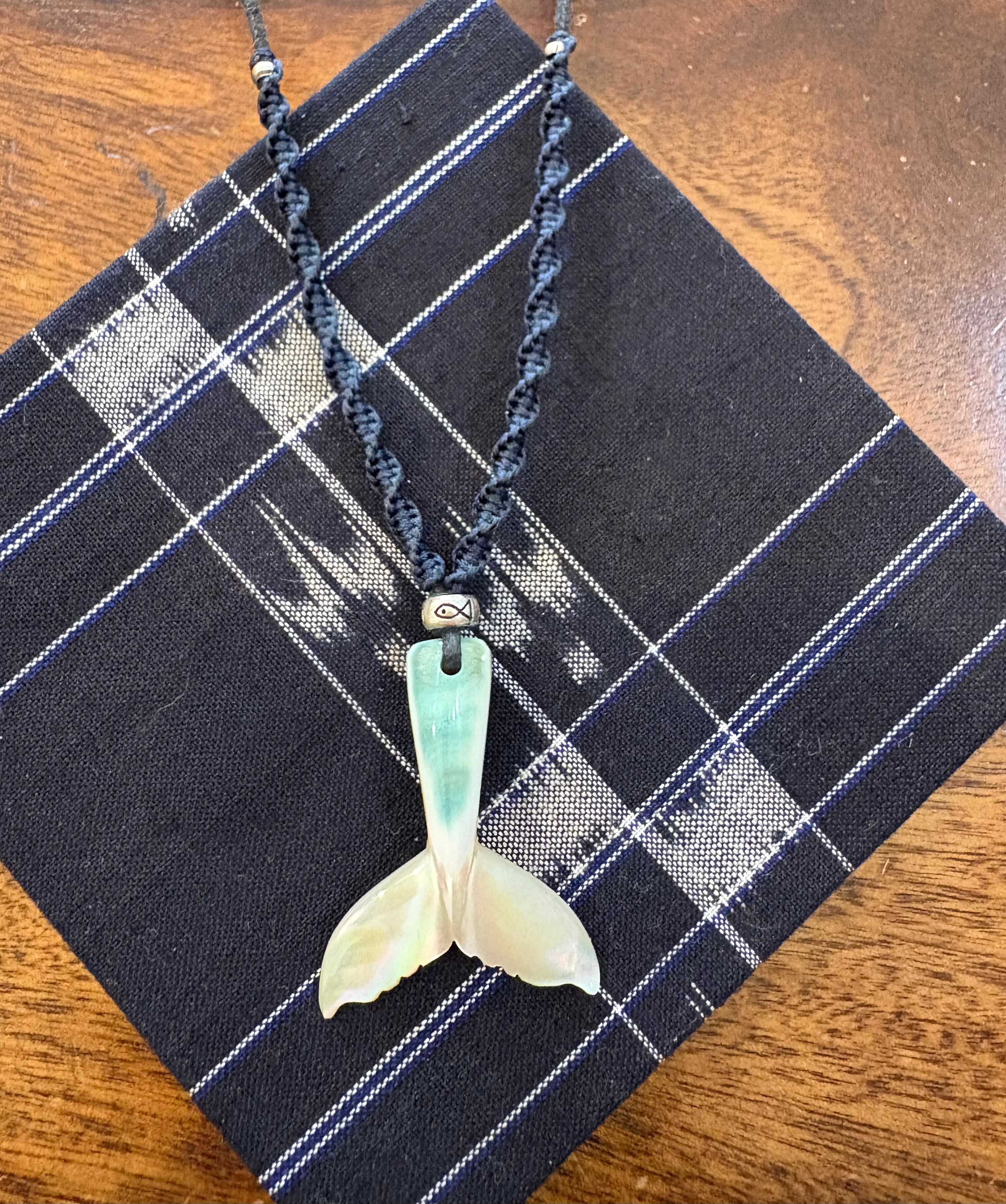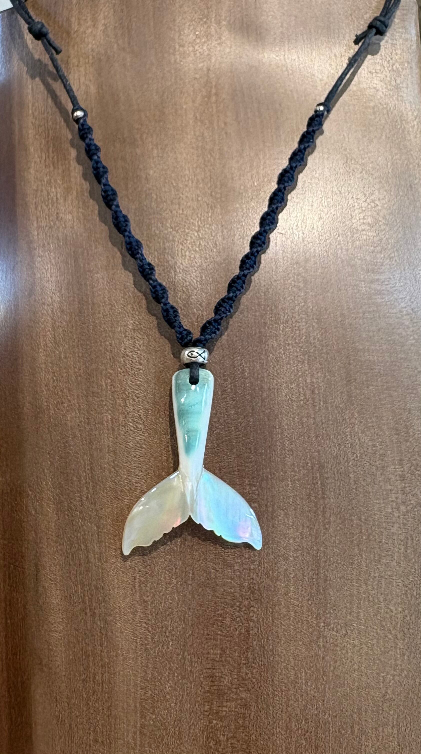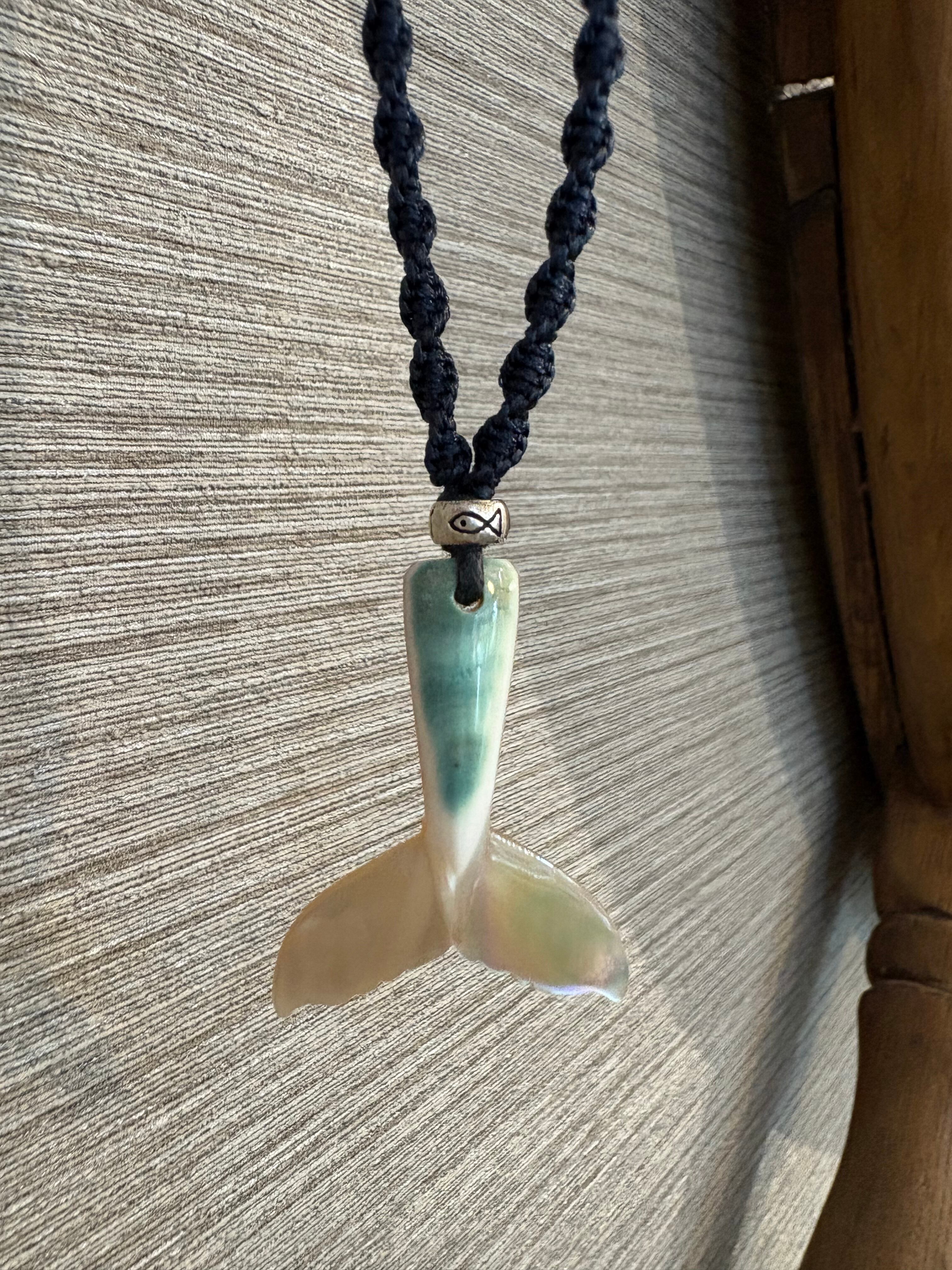 夜光貝テール紐ペンダントは、美しい夜光貝の自然なグリーンと艶が魅力のアイテムです。シルバービーズの魚模様がアクセントとなり、シンプルながらも存在感があります。両サイド編み込まれた紐のデザインがこれからのおしゃれ着にピッタリ。