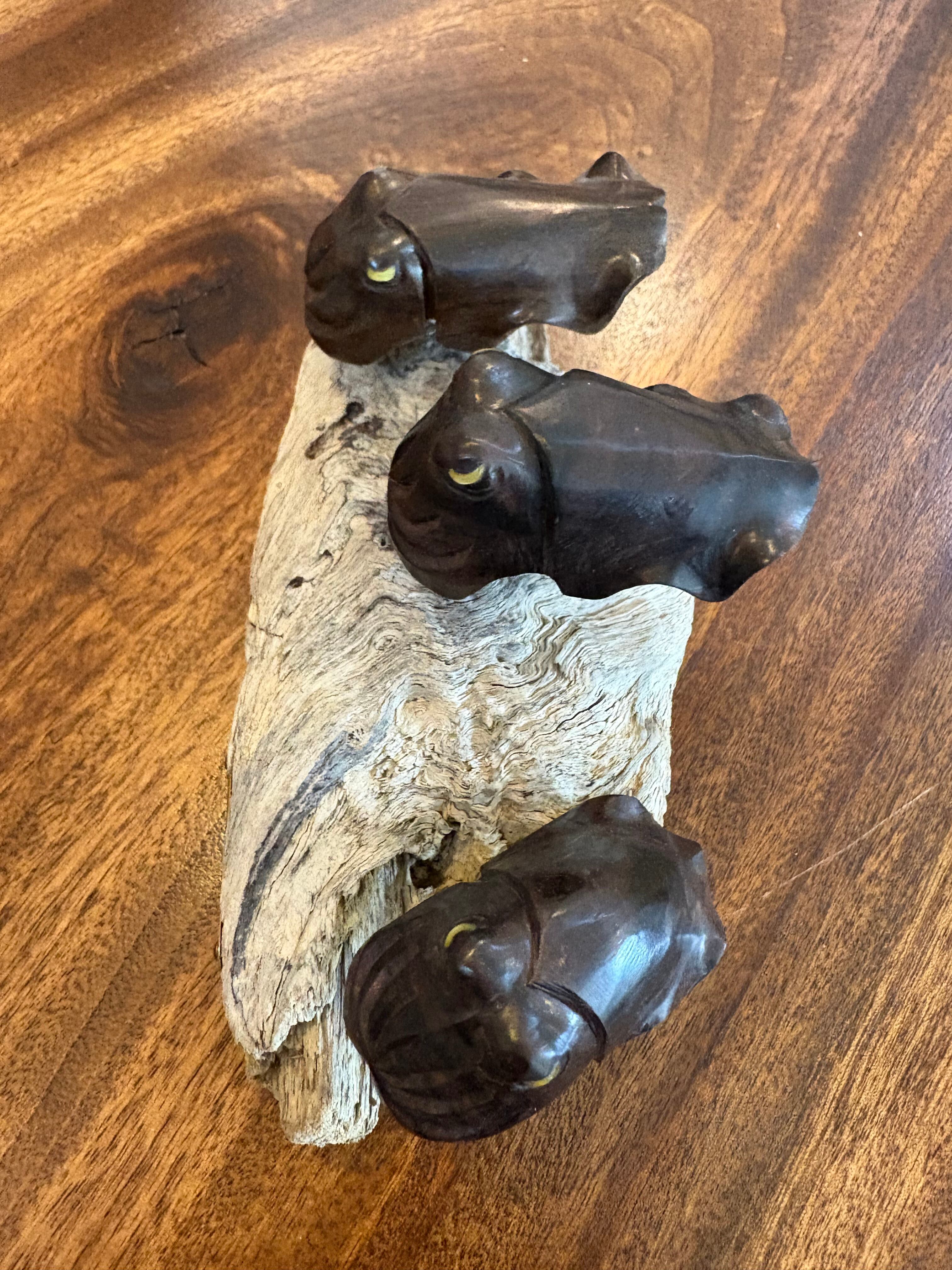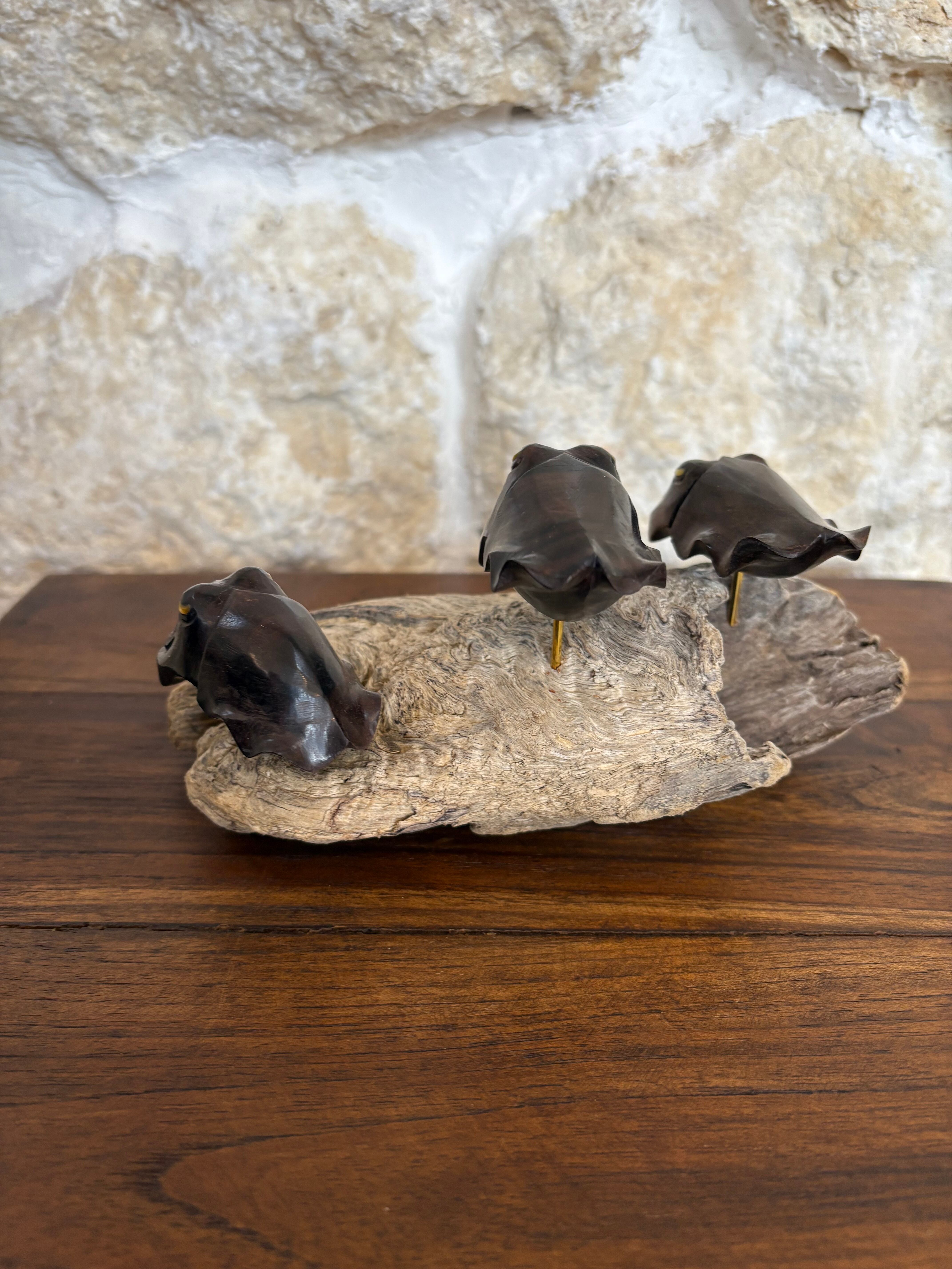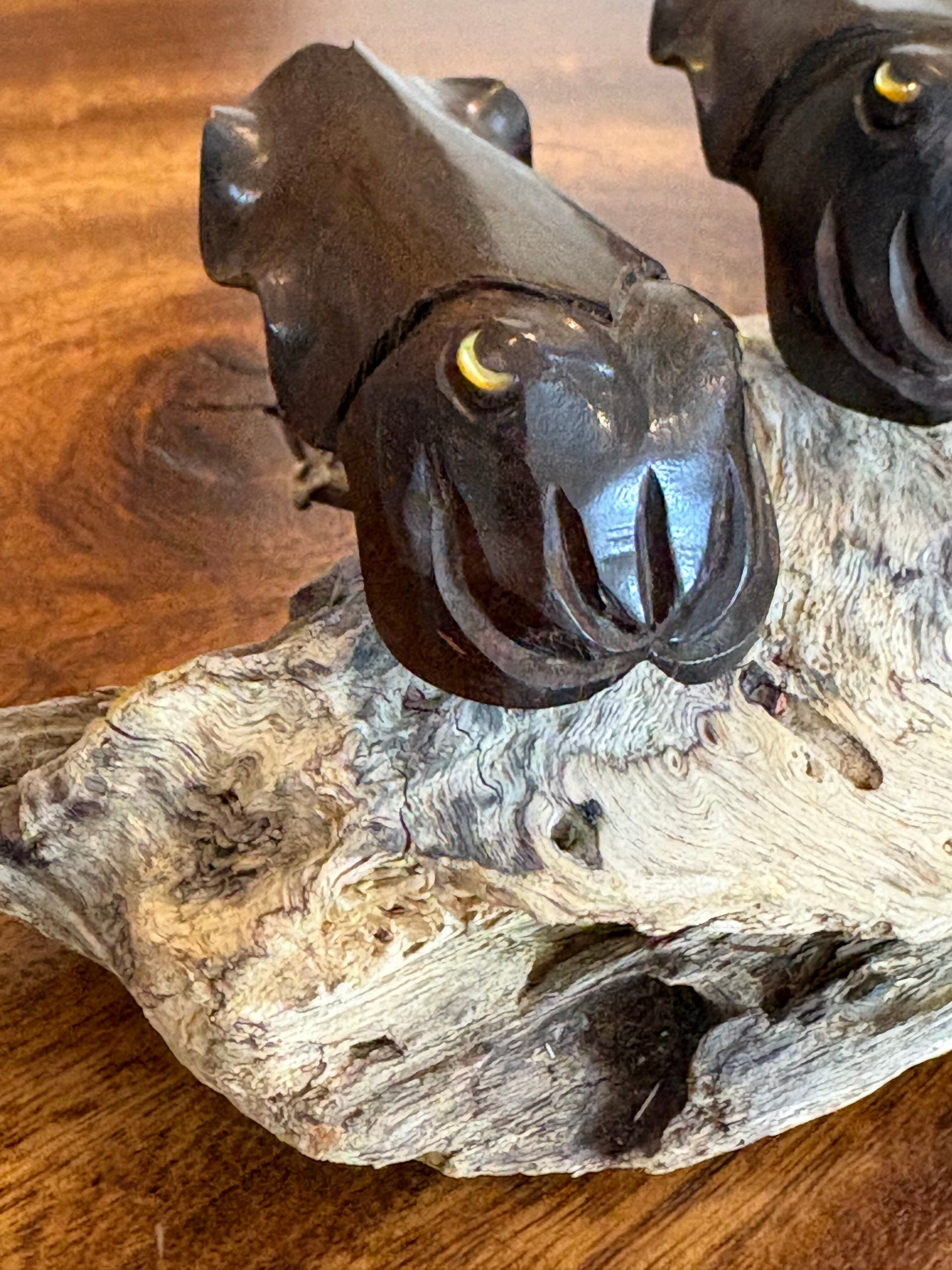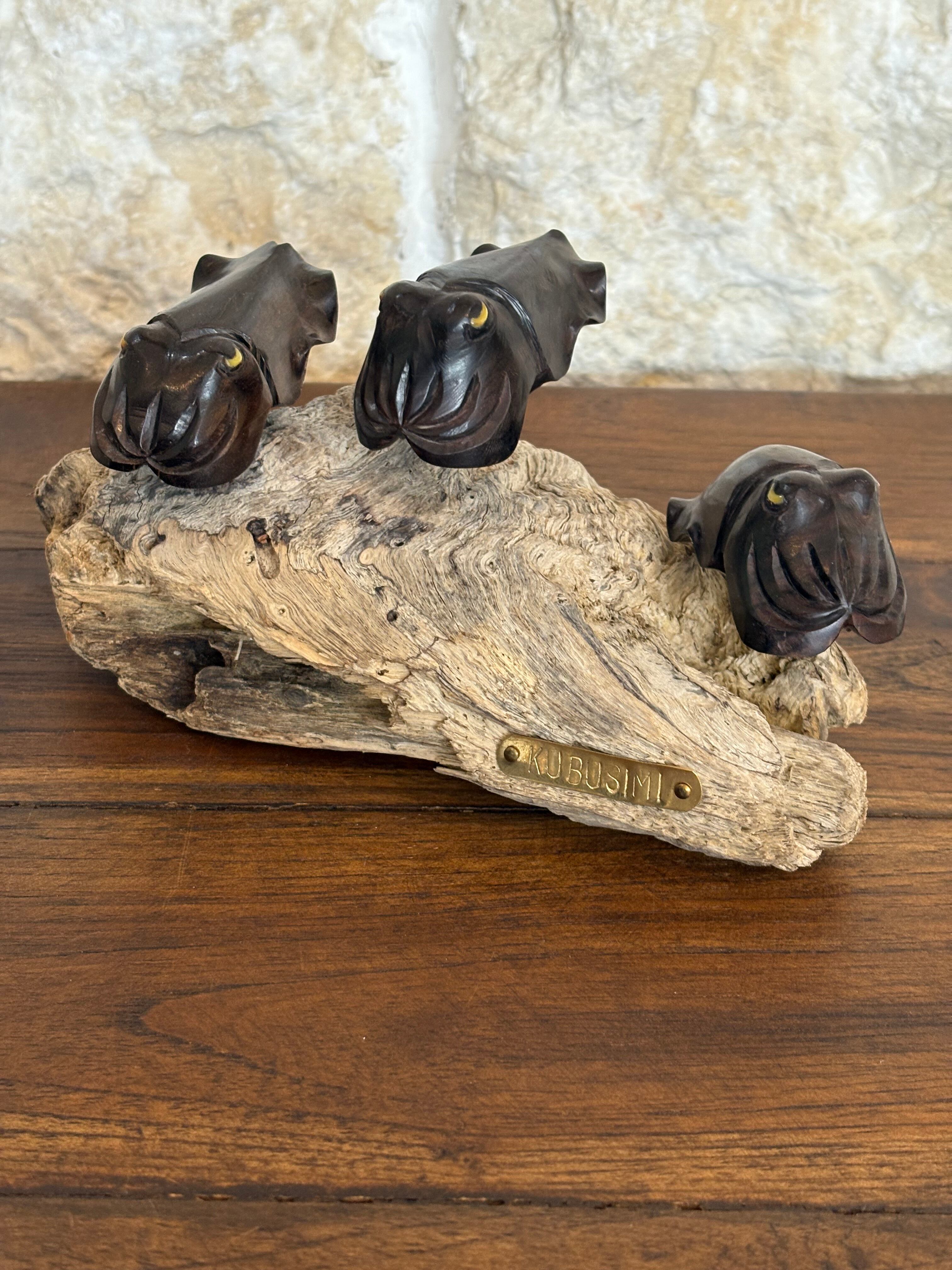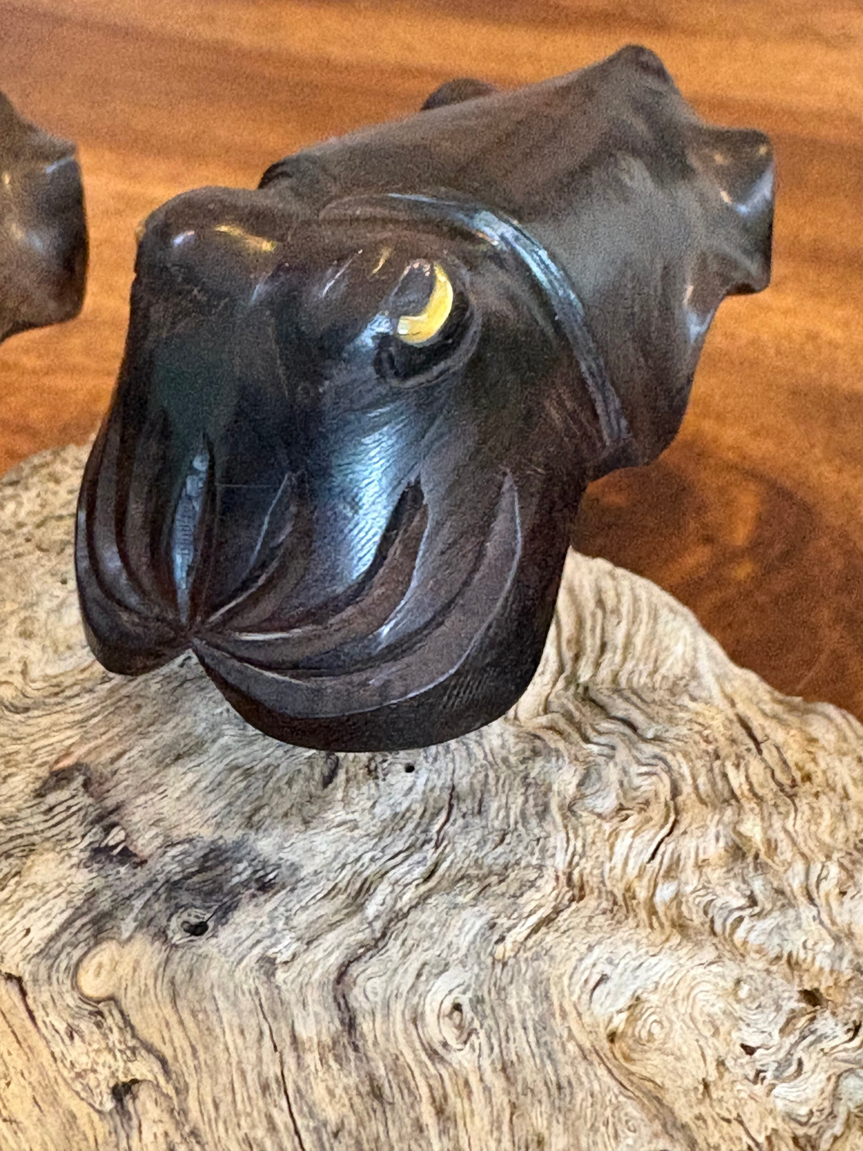 黒檀の重厚感ある質感と白蝶貝の目が印象的なクブシミのオブジェです。台座には自然の流木を使用しています。お部屋やオフィスのインテリアとしてもおすすめです。
