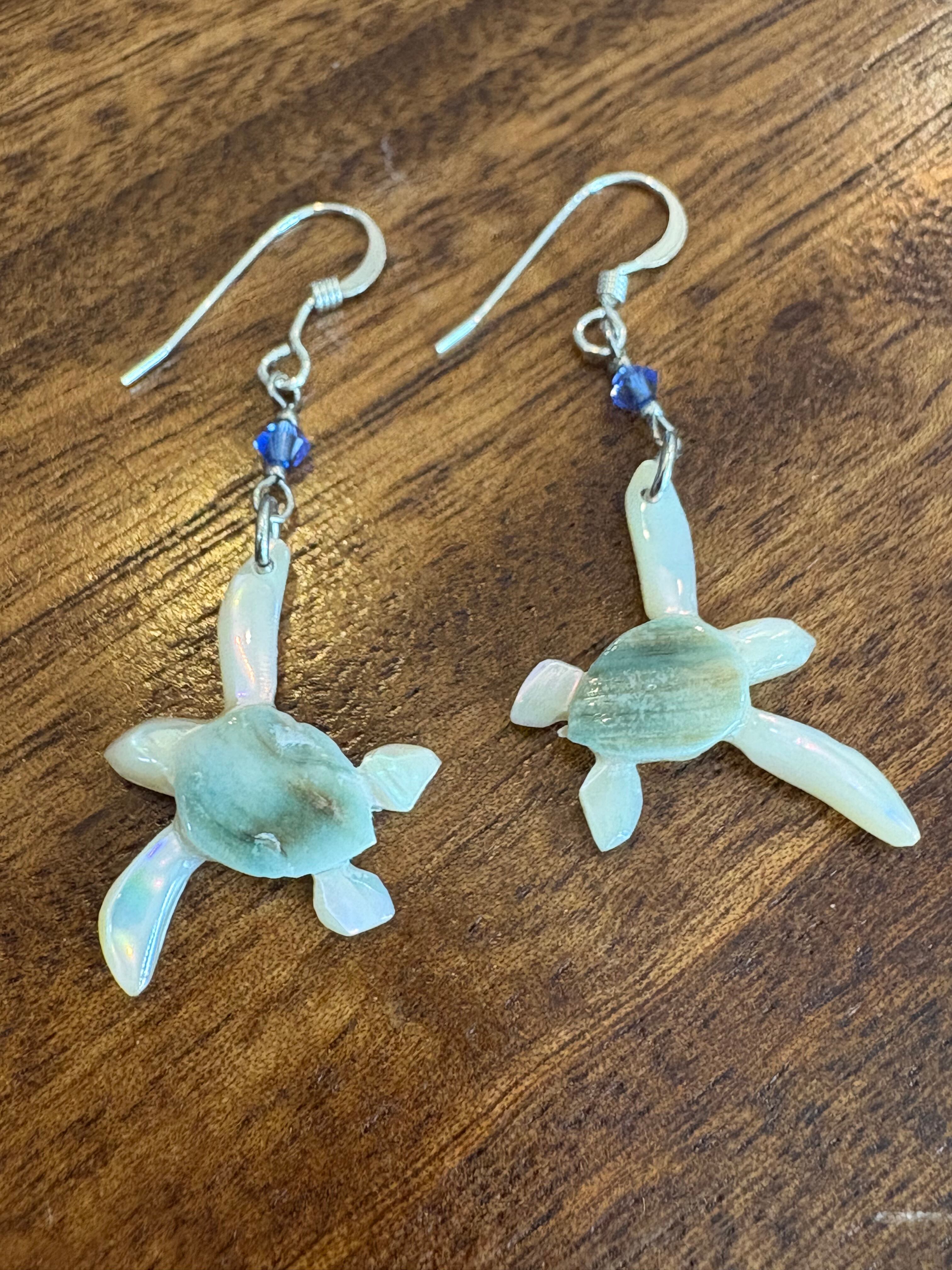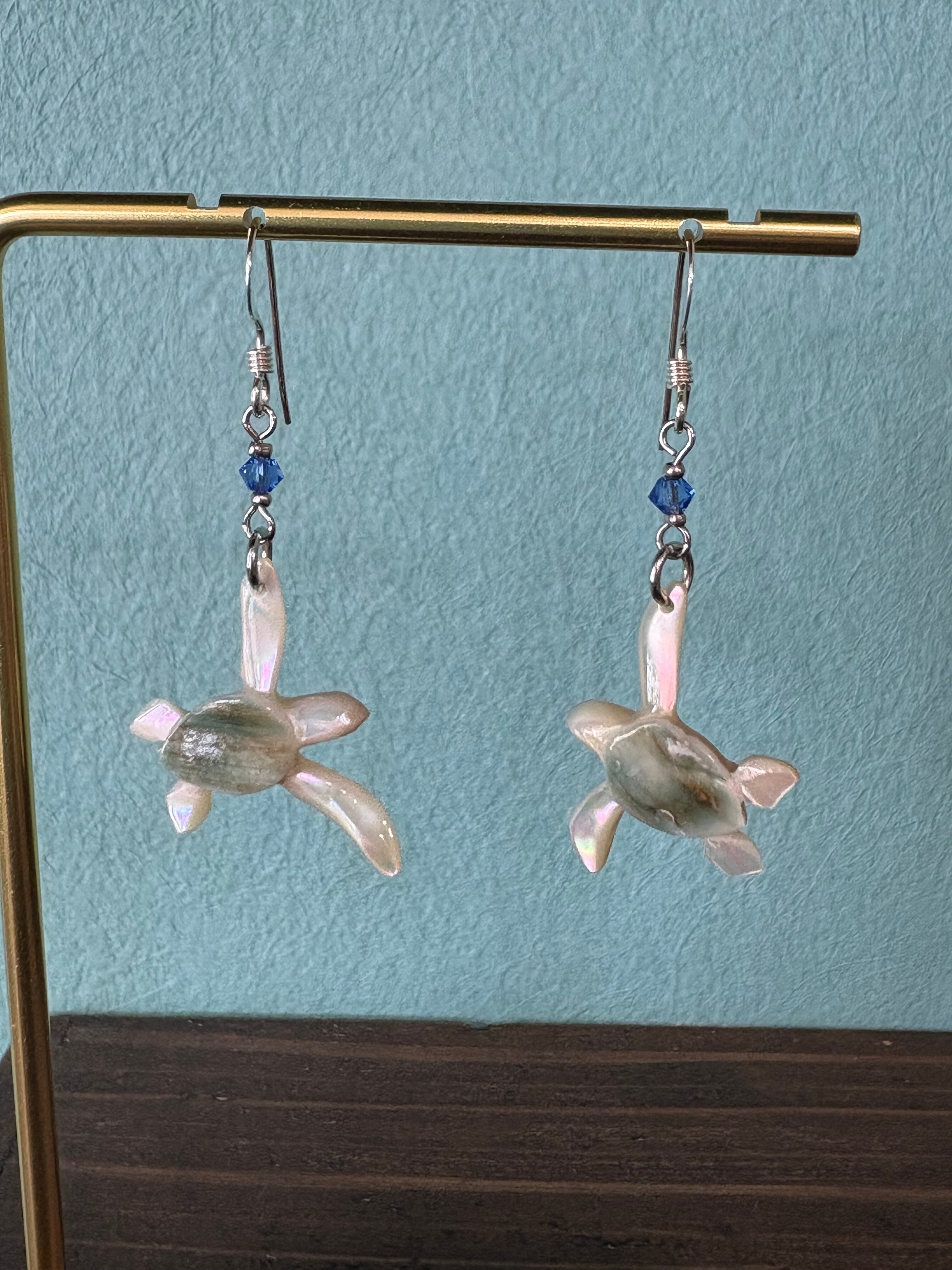 夜光貝の海ガメピアスは、夜光貝を使用した美しいアイテムです。夜光貝の深いグリーンが、海ガメの甲羅をしっかりと表現しています。