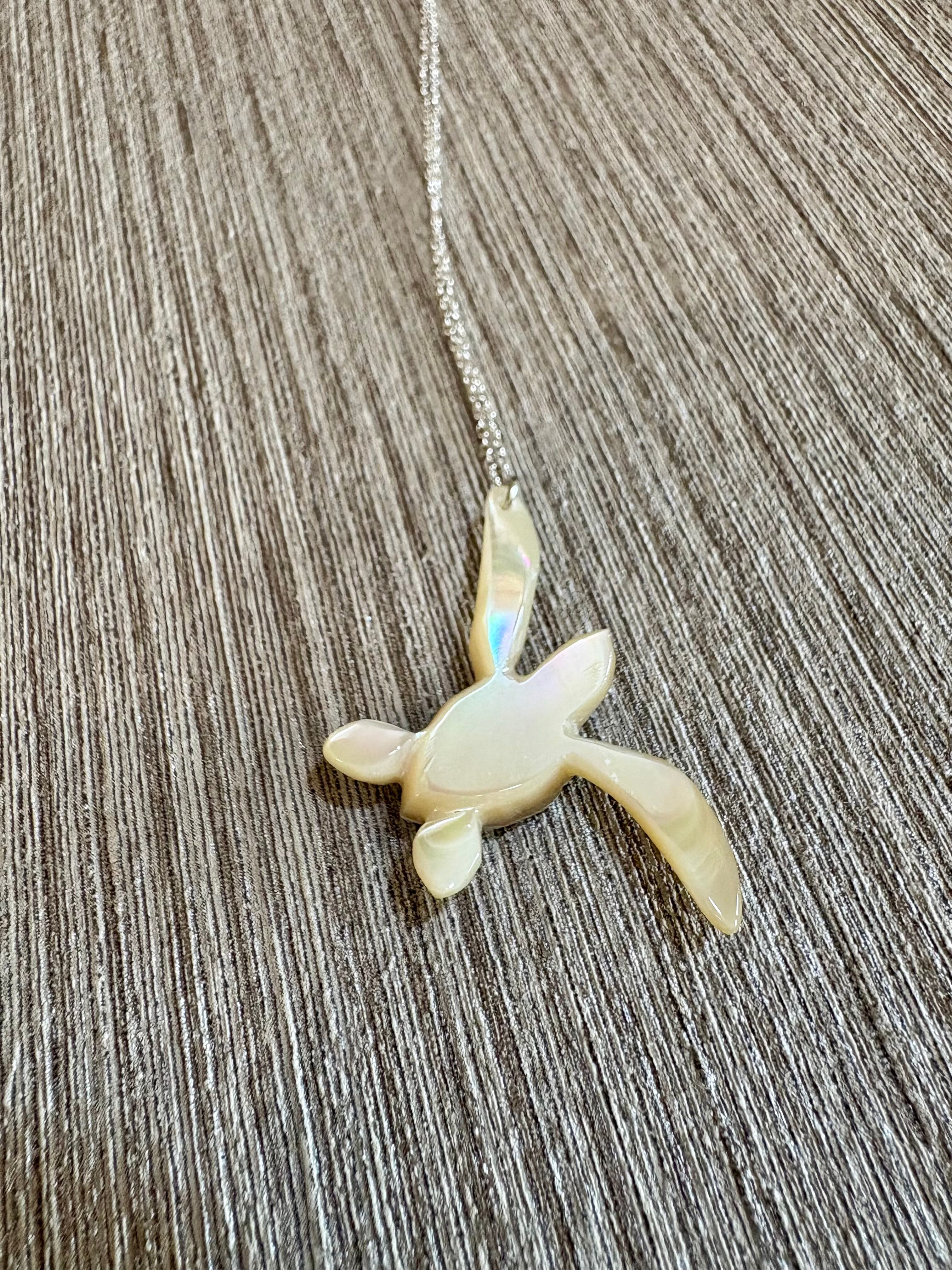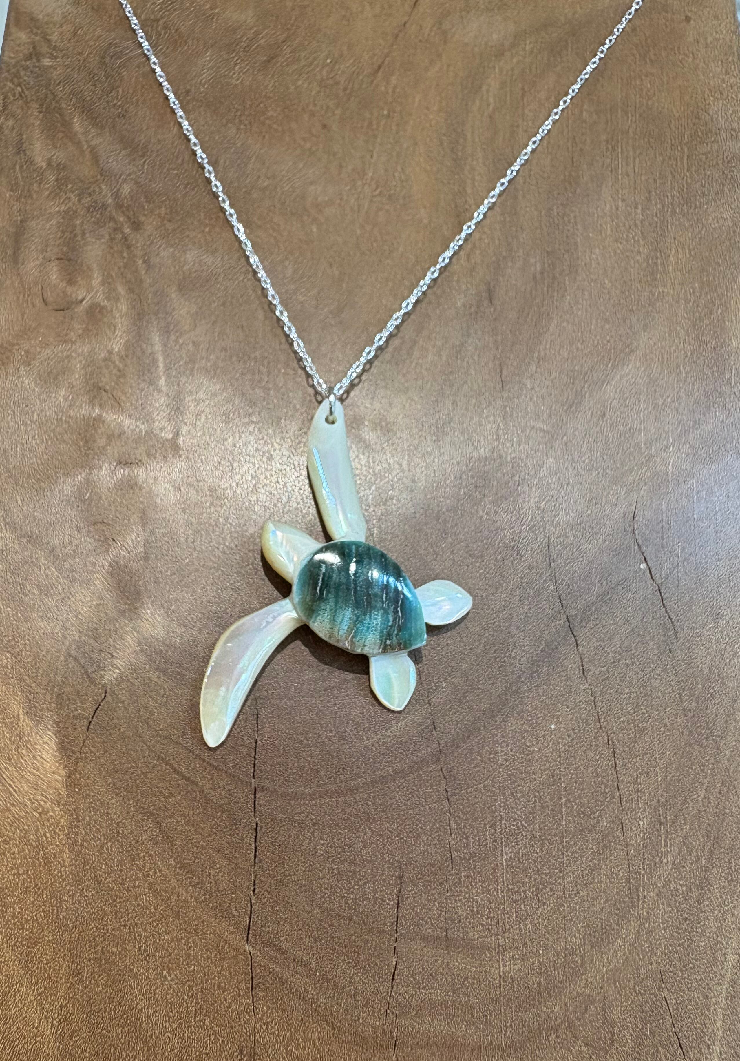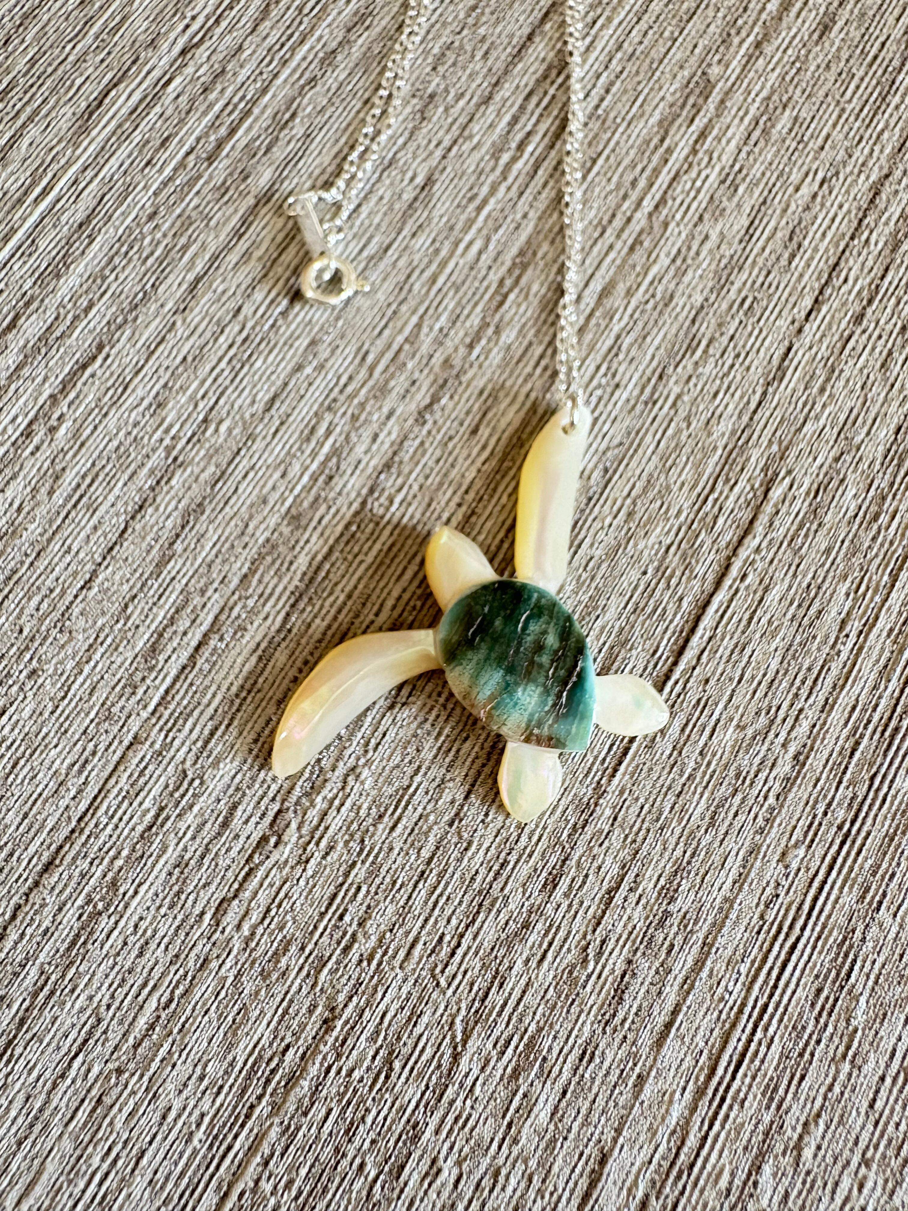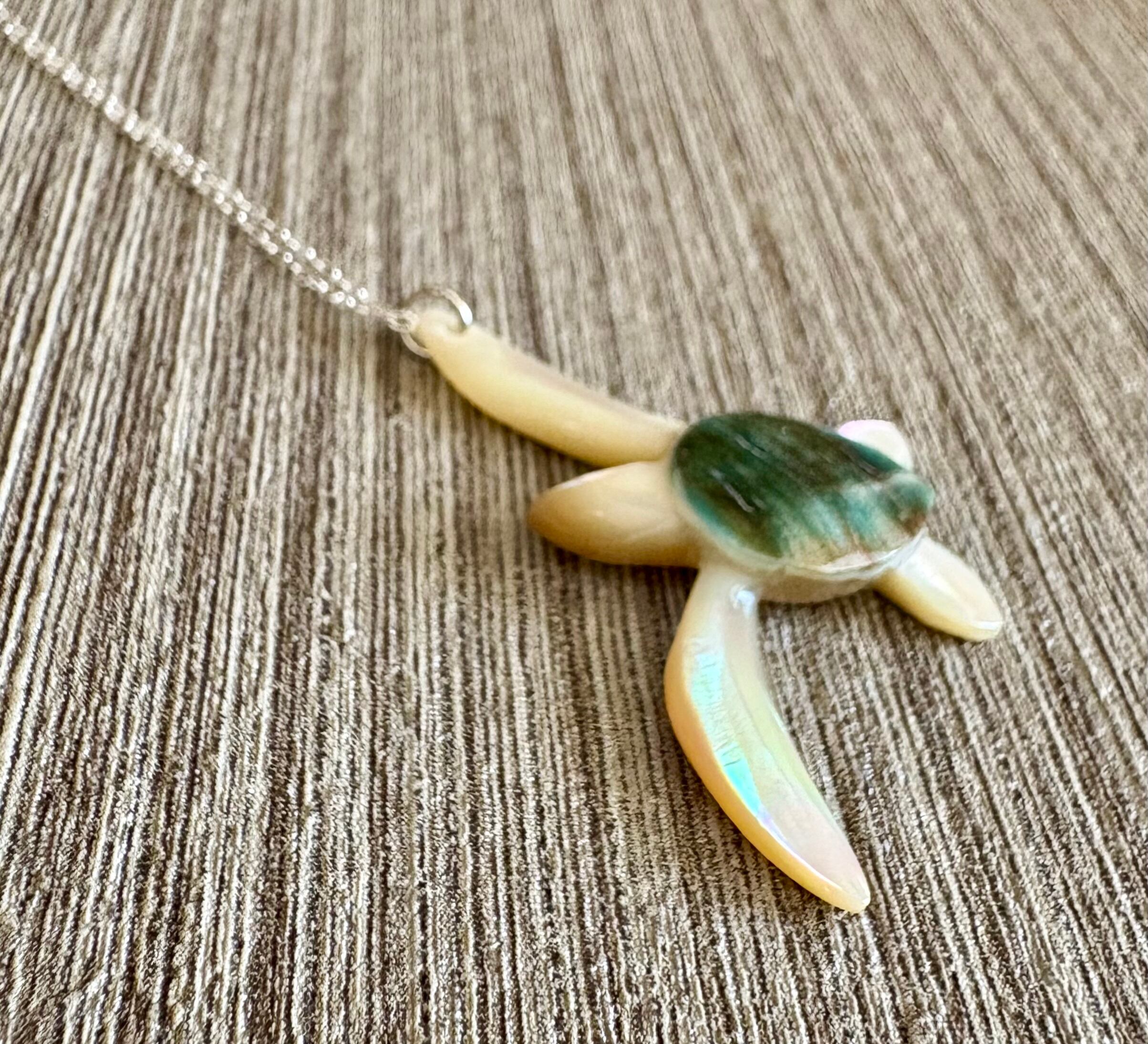夜光貝の海ガメペンダントは、夜光貝を使用した美しいアクセサリーです。リアルに泳いでいる姿を表現し夜光貝のグリーンで甲羅の魅力を際立たせています。