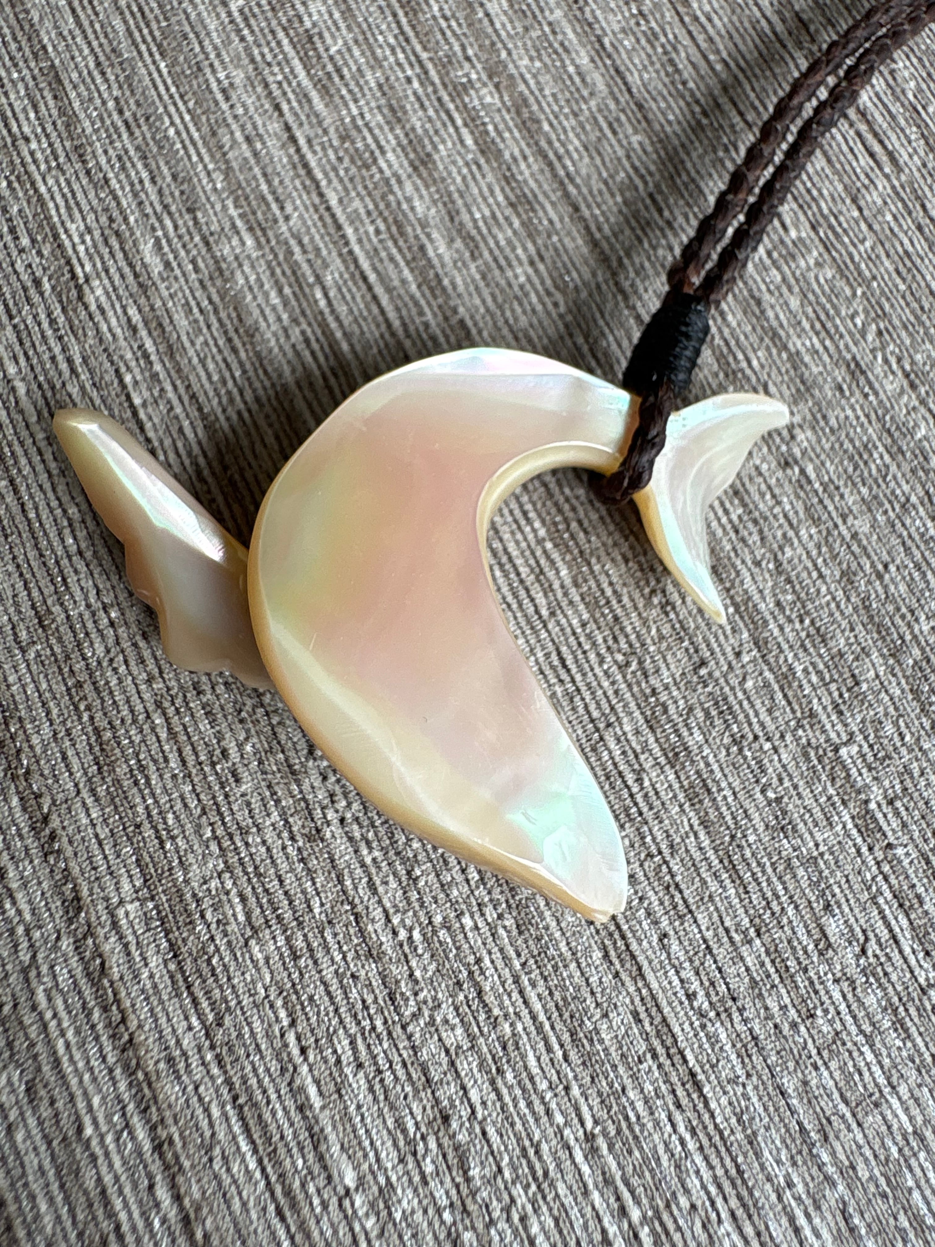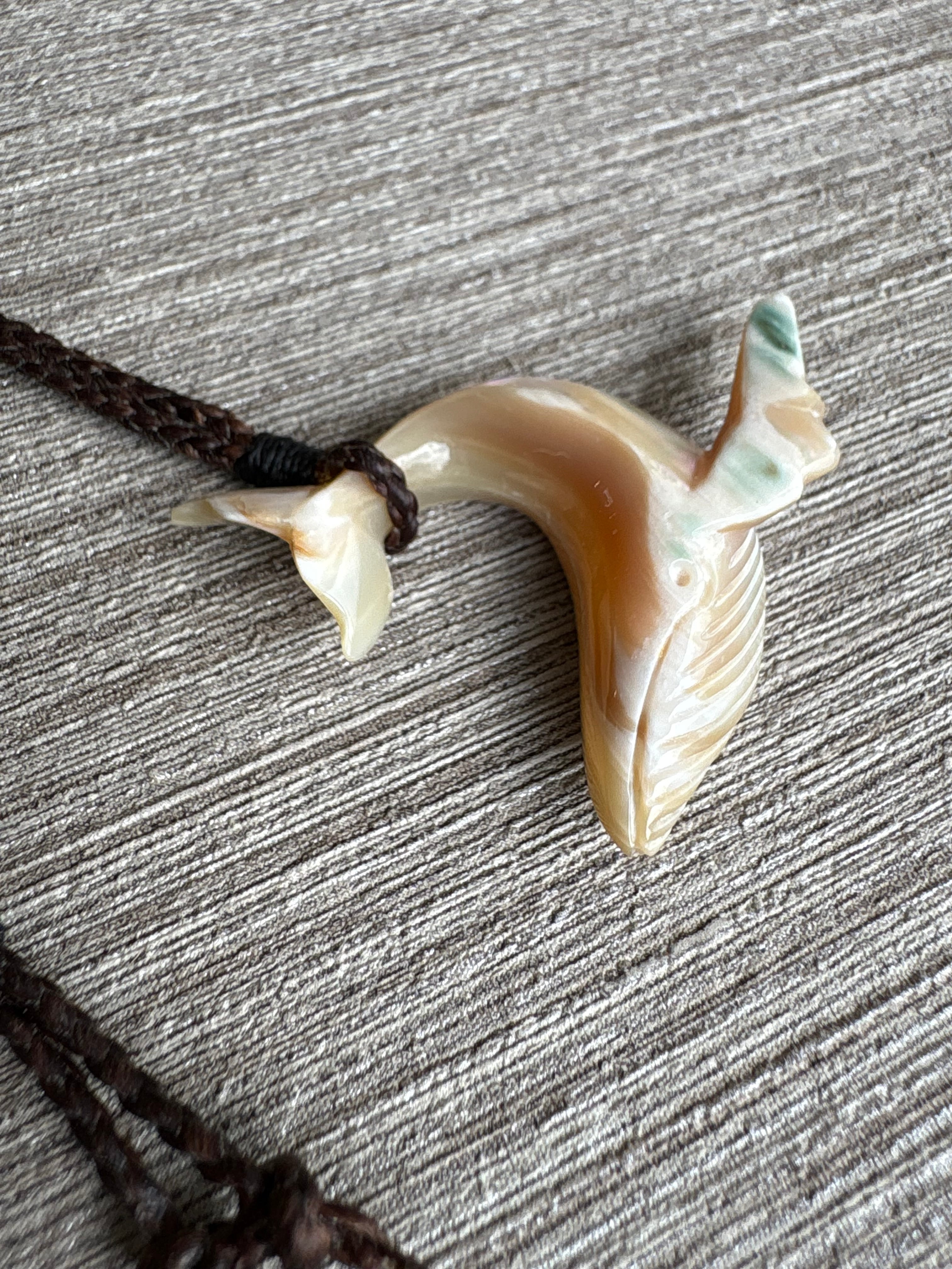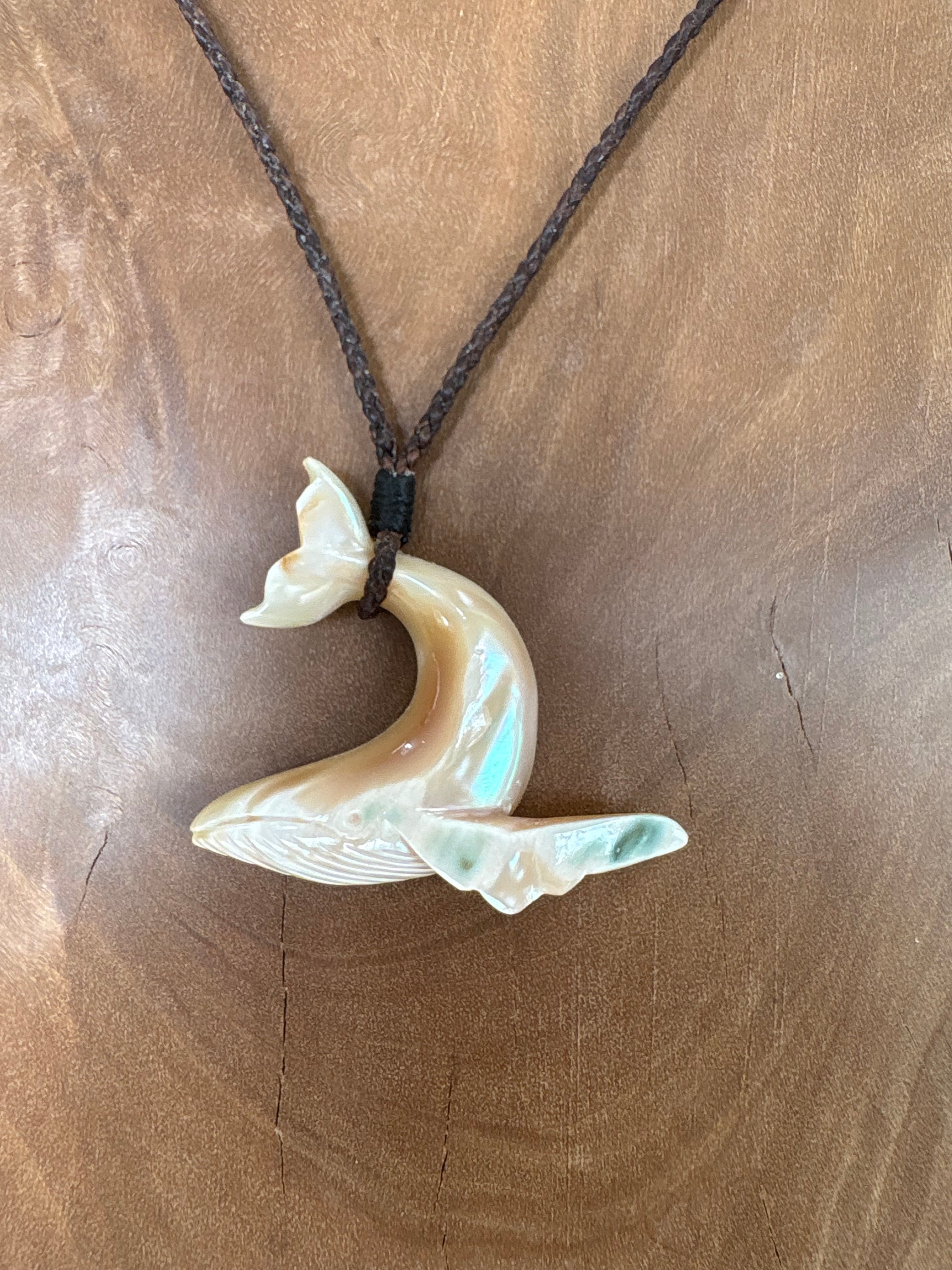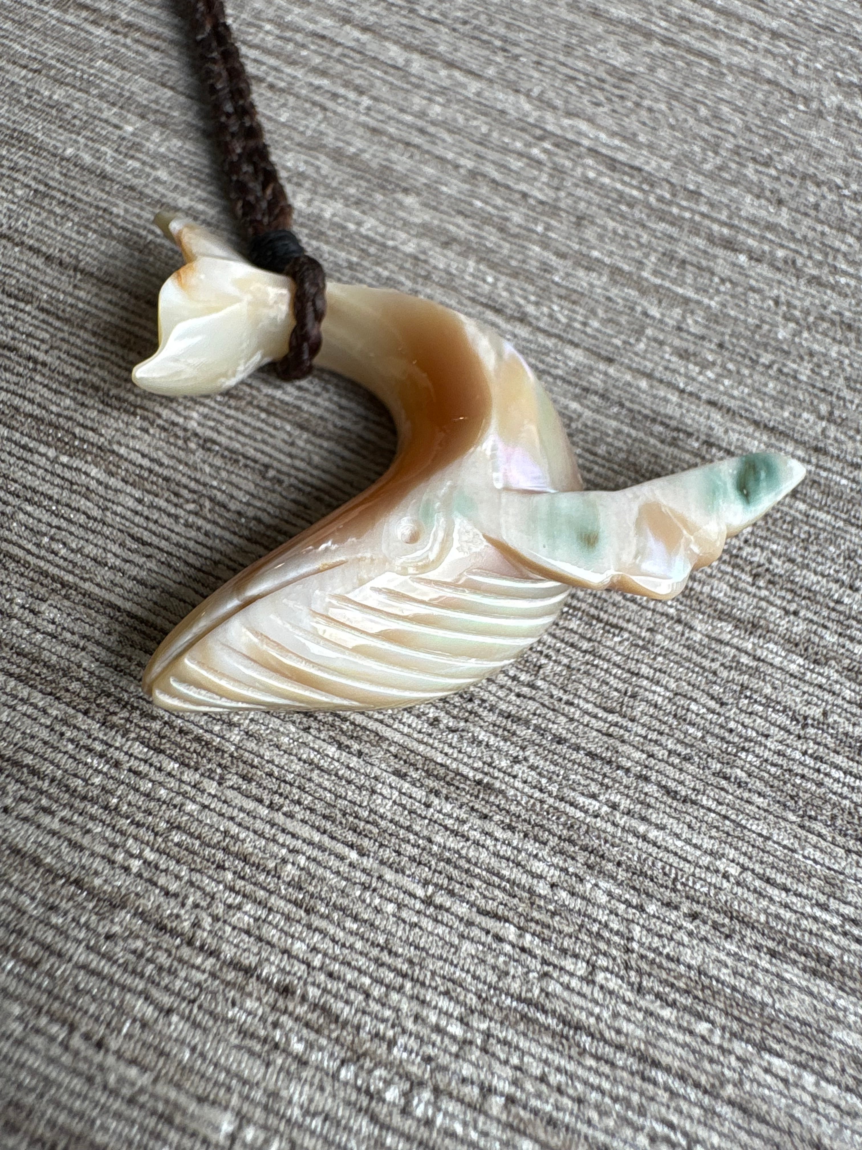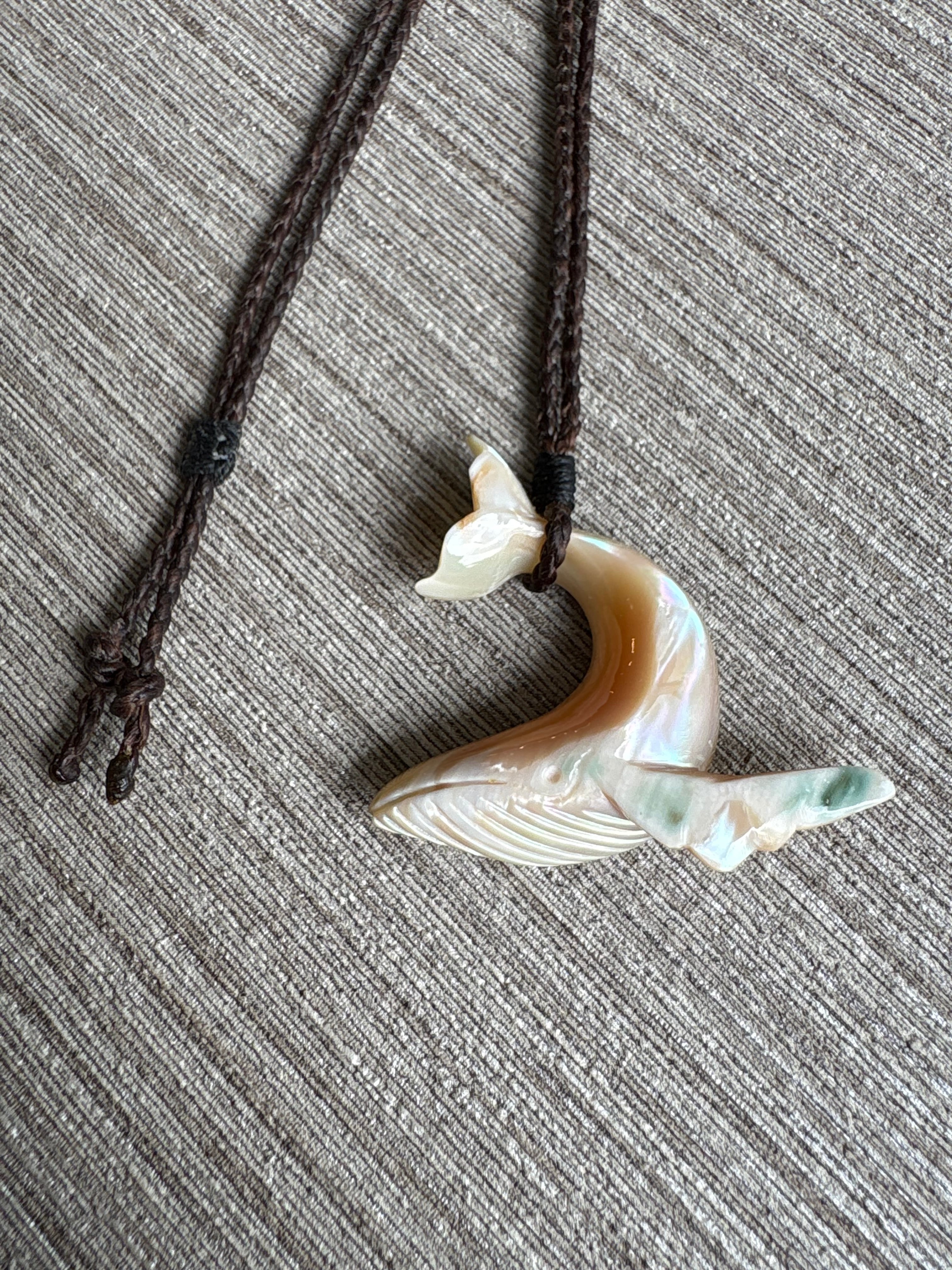 夜光貝クジラのペンダントは、ヒレの部分には美しいグリーンが加わっており、夜光貝の真珠層がリアルなクジラの質感を表現しています。